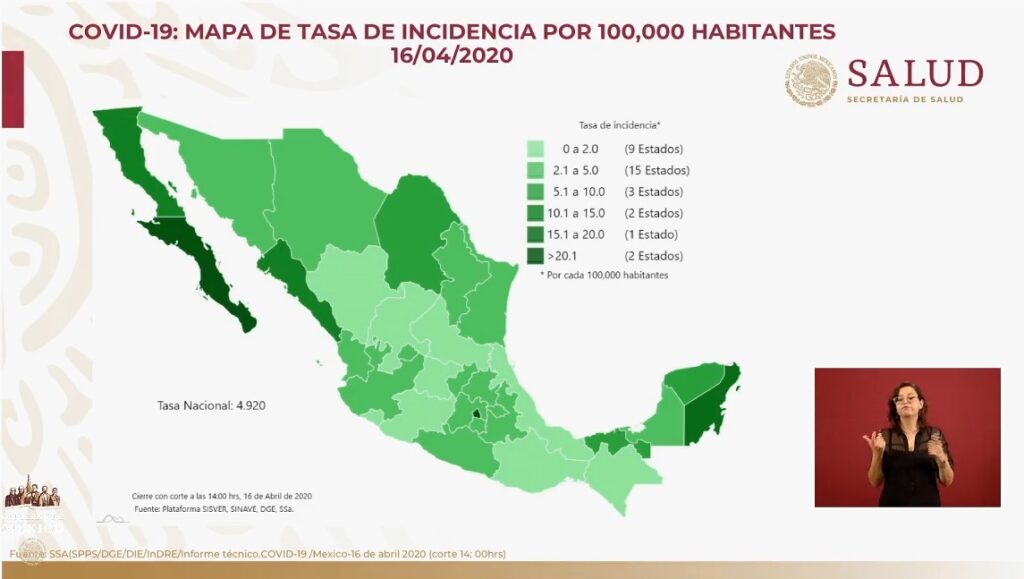 En el país, la tasa de incidencia de casos confirmados es de 4.92 por cada 100 mil habitantes. Los estados que tienen mayor tasa de incidencia de la enfermedad de COVID-19 son Baja California Sur y Ciudad de México (20.1), Quintana Roo (15), Baja California, Sinaloa, Tabasco, Coahuila y Yucatán.