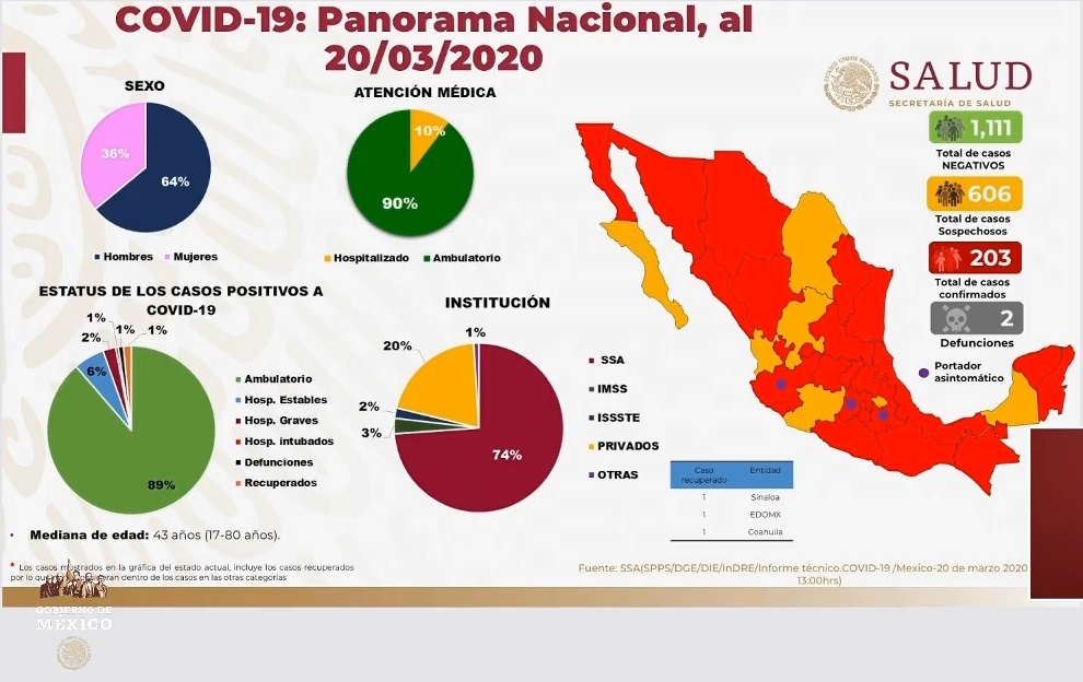 Redacción / La Voz de Michoacán Ciudad de México. En México hay 203 casos confirmados de coronavirus y dos personas han muerto por la enfermedad, confirmaron autoridades de la Secretaría de Salud federal (Ssa) al presentar el último reporte de casos en el país; esto representa un aumento de 39 casos en un día, luego de que ayer jueves se reportaron 164. Hasta la noche de este viernes en México hay 606 casos sospechosos al COVID-19 y mil 111 han dado negativo a la prueba. Solo siete estados del país se mantienen con casos sospechosos: Michoacán, Baja California Sur, Coahuila, Zacatecas, Nayarit, Tlaxcala y Campeche, mientras que en el resto de las entidades hay personas con la enfermedad. Autoridades informaron que el segundo deceso que se reportó en la conferencia de ayer, el cual era sospechoso, finalmente fue confirmado como positivo a coronavirus, por lo que hasta ahora hay dos fallecimientos por la enfermedad, con lo que la tasa de letalidad es de 1 por ciento. De los 203 casos positivos, 64 por ciento son hombres y 36 por ciento mujeres; 90 por ciento de los casos no ha requerido hospitalización y han sido atendidos de manera ambulatoria. De las personas con COVID-19, 6 por ciento está hospitalizado y se encuentra estable, mientras que 2 por ciento está grave. Hasta ahora se mantiene la cifra de pacientes recuperados a la enfermedad, con solo tres casos. Las personas con coronavirus tienen en promedio 43 años, la más joven tiene 17 y la mayor 80 años. En el seguimiento que la Secretaría de Salud federal ha dado a los contactos de personas con coronavirus, al día de hoy se reportó que 66 contactos desarrollaron síntomas, y de estos 27 fueron positivos a SARS-CoV-2, por lo que se consideran casos asociados a importación. De estos 27 casos 1 está en Baja California, 6 en la Ciudad de México, 2 en Querétaro, 2 en Estado de México, 1 en Quintana Roo, 2 en Puebla, 1 en Guerrero, 6 en Jalisco, 3 en Nuevo León y 3 en Yucatán.