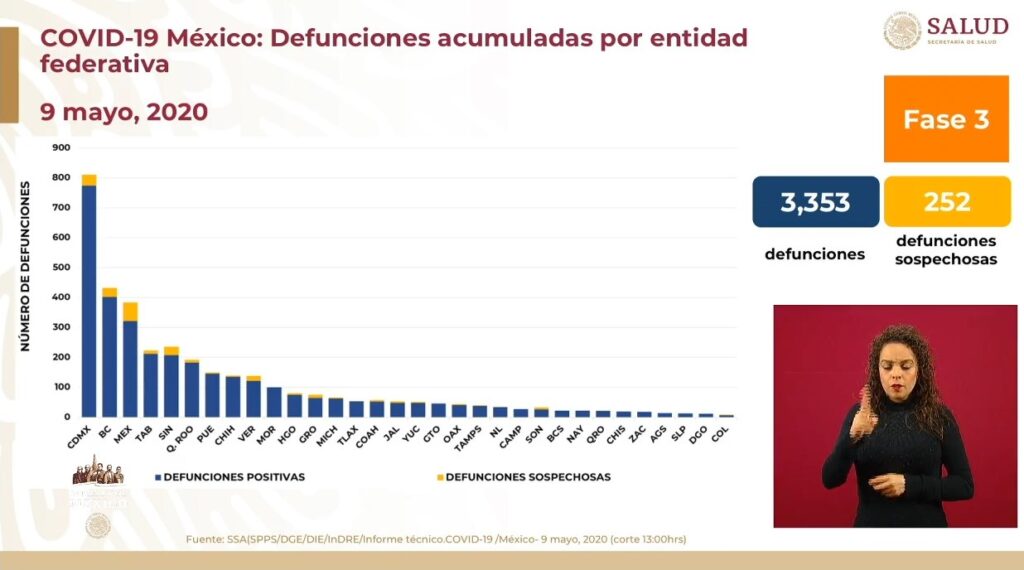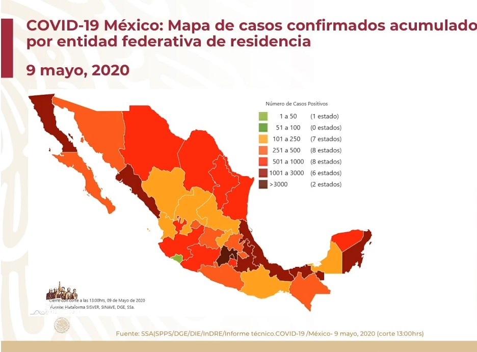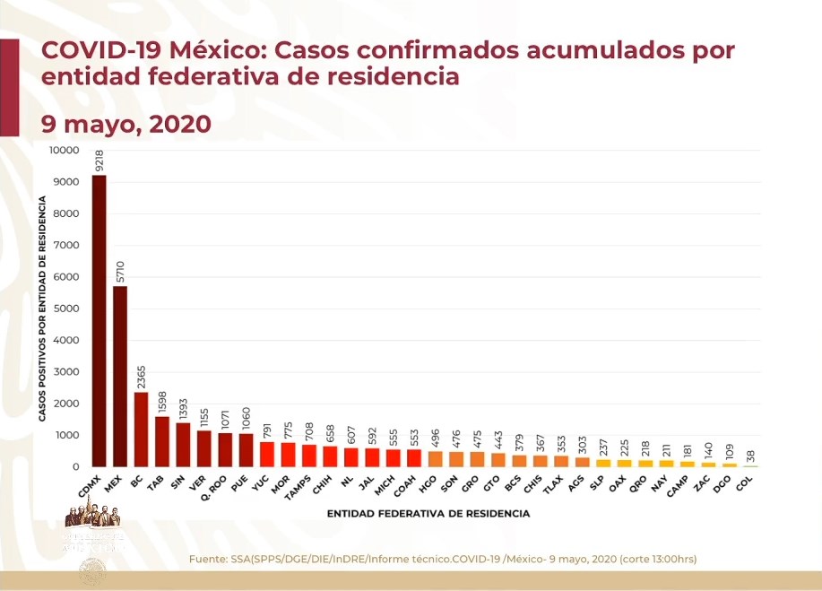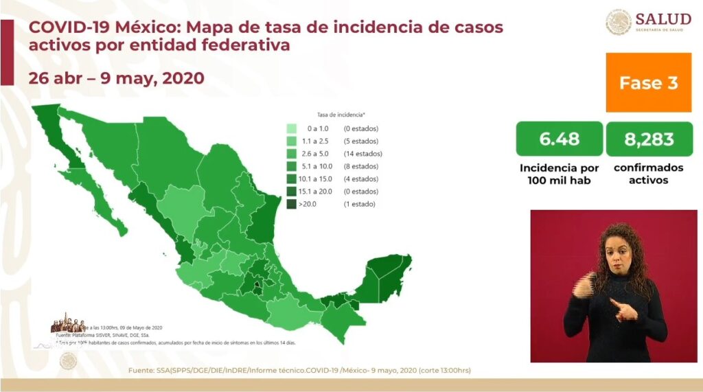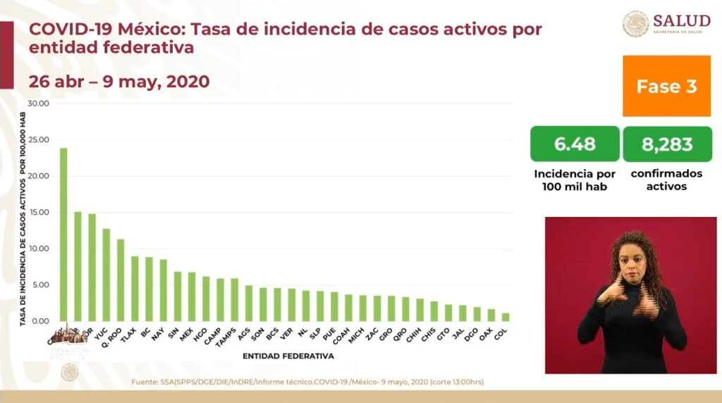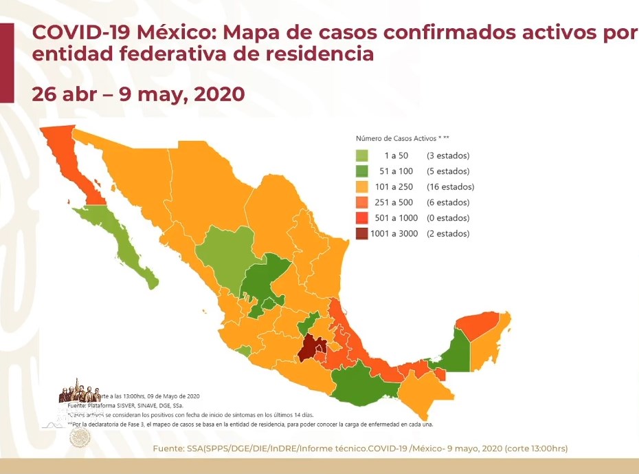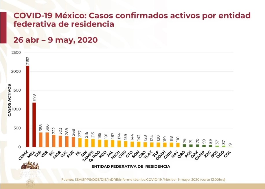 Redacción / La Voz de Michoacán Ciudad de México. En el último día se registraron mil 938 contagios de COVID-19 en todo el país, cifra que actualiza los casos confirmados acumulados a 33 mil 460, de los cuales 3 mil 353 han fallecido, 193 de ellos entre ayer y hoy, informó José Luis Alomía, director general de Epidemiología de la Secretaría de Salud de Michoacán (SSM). Del total de casos acumulados, 8 mil 283 permanecen activos al presentar un inicio de síntomas en los últimos 14 días. Asimismo, hay 20 mil 887 casos sospechosos acumulados. En rueda de prensa, José Luis Alomía señaló que desde el inicio de la epidemia en México se han estudiado a 128 mil 148 personas, de las cuales 73 mil 801 obtuvieron resultados negativos. Agregó que hasta el último corte de las 13:00 horas se confirmaron mil 938 nuevos casos de nuevo coronavirus, un incremento de 6.1 por ciento con respecto al día anterior. Las entidades que reportan más decesos por COVID-19 son Ciudad de México, Baja California, Estado de México, Tabasco, Sinaloa y Quintana Roo. Sobre la disponibilidad hospitalaria, mencionó que a nivel nacional siete mil 25 camas están ocupadas. La mayor parte de la ocupación se reporta en la Ciudad de México con 73 por ciento y Baja California con 59 por ciento. Mientras que las entidades que registran la mayor ocupación de camas para pacientes críticos son la Ciudad de México con 59 por ciento, Estado de México con 52 por ciento y Sinaloa con 48 por ciento. Por casos acumulados, es decir todas las personas diagnosticadas con COVID-19 en el país, incluyendo decesos, recuperados y activos, los estados que presentan más casos son: Ciudad de México (9,218)Estado de México (5,710)Baja California (2,365)Tabasco (1,598)Sinaloa (1,393) Por casos activos, es decir que manifestaron inicio de síntomas de la enfermedad en las últimas dos semanas, las entidades con más casos son: Ciudad de México (2,152)Estado de México (1,179)Tabasco (388)Veracruz (386)Baja California (322) La tasa de incidencia de casos activos en el país es de 6.48 por cada 100 mil habitantes, y las entidades con mayor índice son: Ciudad de México (23.86)Tabasco (15.08)Morelos (14.82)Yucatán (1274)Quintana Roo (11.31) Casos por día Fuente: DGE. Diseño: La Voz de Michoacán. Fuente: DGE. Diseño: La Voz de Michoacán.