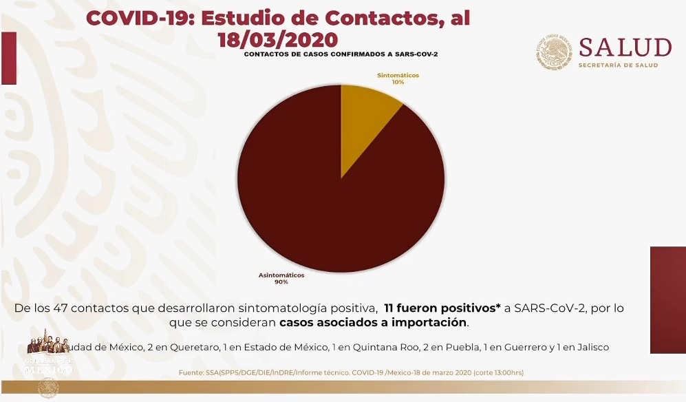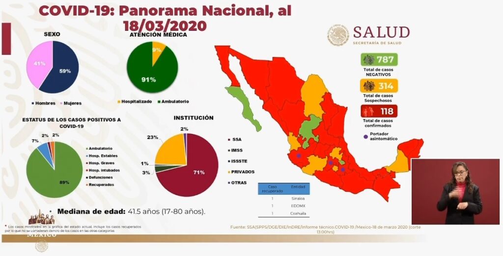 Redacción / La Voz de Michoacán Ciudad de México. México suma 118 casos confirmados de coronavirus, 25 más acumulados en las últimas 24 horas, informaron autoridades de la Secretaría de Salud federal (Ssa) en la conferencia de prensa de esta noche. Al último corte de la autoridad sanitaria se registran 314 casos sospechosos en todo el país, mientras que 787 casos han sido negativos a COVID-19. Solo 3 estados se mantienen con casos negativos: Baja California sur, Zacatecas y Tlaxcala, mientras que 6 han presentado casos sospechosos: Michoacán, Nayarit, Coahuila, Morelos, Hidalgo y Campeche –que hasta ahora no han dado positivo- y el resto de las entidades del país tiene casos positivos. De los 118 casos confirmados 59 por ciento son hombres y 41 por ciento mujeres; la mayoría de ellos, 91 por ciento, no han requerido hospitalización. De los casos positivos a COVID-19, 7 por ciento se encuentra estable en algún hospital y 2 por ciento está grave. Tres pacientes se han recuperado: uno en Sinaloa, 1 en Estado de México y 1 en Coahuila. El paciente más joven con coronavirus en México tiene 17 años y el de mayor edad tiene 80, con lo que la mediana de edad es de 41.5 años. De los casos confirmados a la enfermedad 71 por ciento ha sido atendido en hospitales de la Secretaría de Salud federal y 23 por ciento en instituciones privadas; el resto ha acudido al IMSS y al ISSSTE. De acuerdo con el estudio de contactos de pacientes confirmados, hasta este miércoles 47 personas presentaron síntomas de COVID-19, de los cuales 11 dieron positivo a SARS-CoV-2, por lo que se consideran casos asociados a importación. De estas personas contagiadas que estuvieron en contacto con personas enfermedad 3 están en la Ciudad de México, 2 en Querétaro, 1 en Estado de México, 1 en Quintana Roo, 2 en Puebla, 1 en Guerrero y 1 en Jalisco.