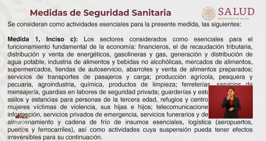 Redacción / La Voz de Michoacán Ciudad de México. Esta mañana el subsecretario de Salud, Hugo López Gatell, puntualizó cuáles son las actividades esenciales que no pueden parar en la contingencia, y por ende cuáles serían las que se detendrán. Será hasta el 30 de abril que actividades NO ESENCIALES deberán parar con la finalidad de que la gente se quede en sus casas. López Gatell precisó que las actividades esenciales, que van a seguir, son: A. Aquellas necesarias para atender la contingencia sanitaria, es decir, las que engloba la rama médica, desde lo operativo hasta lo administrativo. B. También se consideran actividades esenciales las de seguridad, impartición de justicia y la actividad legislativa. C. El sector financiero, de recaudación tributaria, distribución y venta de energéticos, gasolina y gas, también se considera esencial la actividad para el servicio de agua potable, la industria de alimentos y bebidas no alcohólicas, mercados de alimentos, supermercados, tiendas de autoservicio, abarrotes y venta de alimentos preparados, también se contemplan servicios de transportes de pasajeros y de carga, la producción agrícola, pesquera y pecuaria; así como la agroindustria, la industria química y los productos de limpieza; las ferreterías, los servicios de mensajería, guardias en labores de seguridad privada, guarderías, asilos, estancias para dultos mayores, refugios, centros de atención de la violencia a las mujeres, telecomunicaciones, servicios de emergencias, funerarias; seguirán activos los aeropuertos, ferrocarriles, y actividades cuya suspensión pueda tener efectos irreversibles para su continuación. D. Tareas para realizar programas públicos (aunque habrá personal reducido en oficinas accesorias) E. Labores para mantener la infraestructura y funcionamiento de los servicios básicos (agua, energía, gas petroleo, gasolina, turbosina, saneamiento básico, transporte público, infraestructura hospitalaria y médica de primer nivel). Todas aquellas que no entren en la lista anterior, deberán detenerse. López Gatell también detalló cuáles son las medidas acordadas el día de ayer por el gobierno federal. Mientras que las medidas establecidas por el Gobierno Federal, ante la declaración de emergencia sanitaria, son las siguientes: • Suspensión de 30 marzo al 30 de abril actividades no esenciales de los sectores público, privado y social.• No se realizarán reuniones o asambleas de más de 50 personas.• Cumplir el resguardo domiciliario, limitación voluntaria de movilidad, que se aplica de manera estricta a personas mayores de 60 o con enfermedades que los vuelven vulnerables al COVID-19.• El personal esencial de interés público podrá ir de manera voluntaria a trabajar.• Una vez que pase la contingencia, la Secretaría del Trabajo y Previsión Social (STPS), en coordinación con la Secretaría de Economía, darán la pauta para que las actividades regresen a su normalidad de manera escalonada.• Postergar hasta nuevo aviso los censos y encuestas.• Todas las medidas se tienen que respetar con debido apego a los derechos humanos.