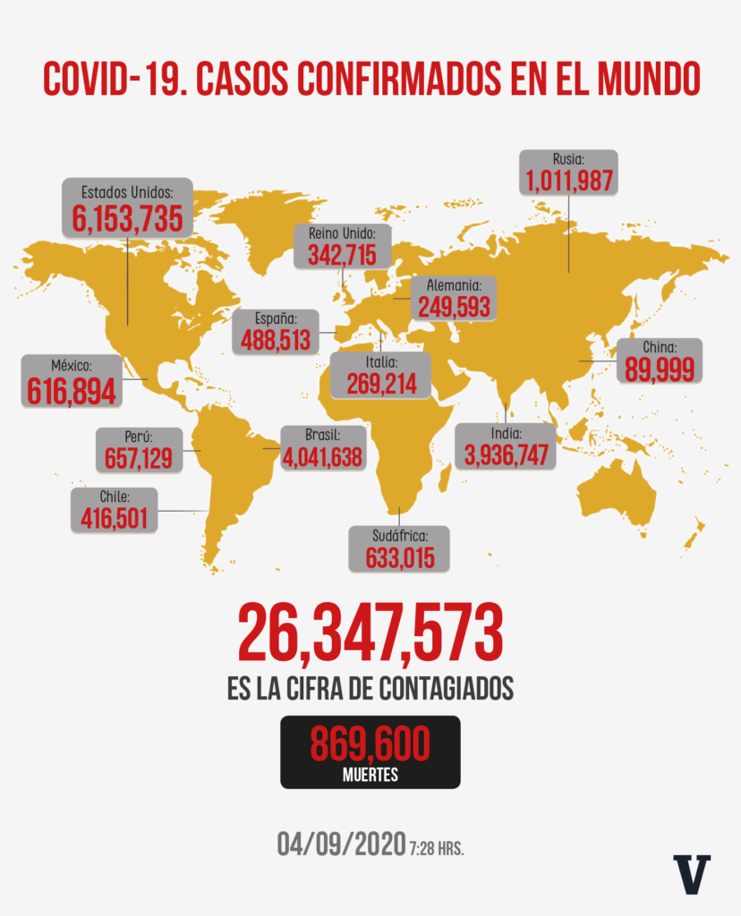 Enrique Santiago / La Voz de Michoacán Morelia, Michoacán La pandemia de COVID-19 se mantiene constante en la mayoría de las regiones. ya cuatro naciones superan el millón de contagios. Solamente Estados Unidos, Brasil, India y Rusia acumulan 15 millones 144 mil 107 contagios. Te presentamos un panorama global actualizado al 4 de septiembre de 2020 sobre el comportamiento del COVID-19. Fuente: Johns Hopkins University of Medicine. Diseño: Enrique Santiago,La Voz de Michoacán. El cúmulo de contagios en el mundo sigue al alza y hoy se registran 26 millones 347 mil 573. En América, el top 5 está integrado por Estados Unidos, Brasil, Perú, Colombia y México, todos por encima de los 600 mil casos. Fuente: Dirección General de Epidemiología de la Ssa. Diseño: Enrique Santiago, La Voz de Michoacán. Con las 513 muertes por COVID-19 que se registraron en las últimas 24 horas, México alcanzó las 66 mil 329 defunciones de personas que tenían esta enfermedad, en poco más de seis meses de epidemia en el país. Fuente: Centro Estatal de Operaciones COVID-19 de la SSM. Diseño: Enrique Santiago, La Voz de Michoacán. En Morelia continúa creciendo el número de contagios y muertes por COVID-19, este jueves es el municipio michoacano en donde más personas murieron y se enfermaron el nuevo coronavirus, con 7 nuevas muertes y 57 nuevos contagiados.