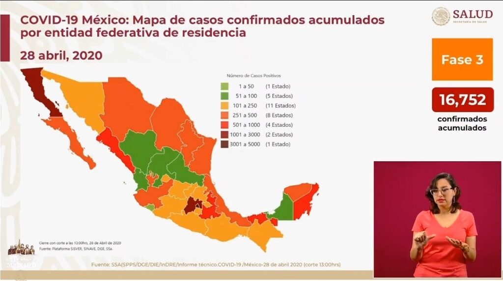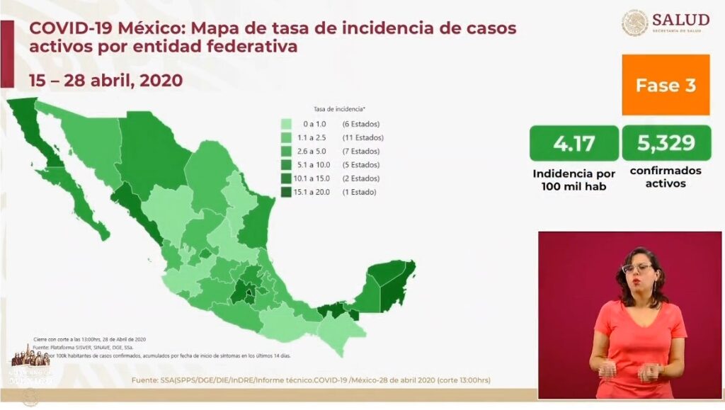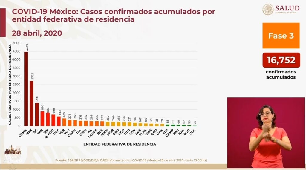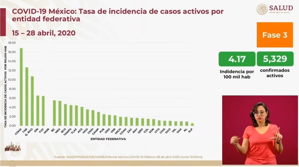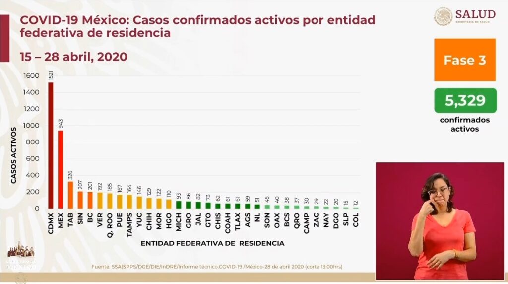 Ciudad de México. Con 1,223 contagios nuevos en el último día, México llegó a 16,752 casos confirmados de COVID-19, de los cuales 5,329 se mantienen activos, es decir, que presentaron síntomas en los últimos 14 días, informaron este martes autoridades de la Secretaría de Salud federal (Ssa). Los decesos en el país suman ya 1,569 de los cuales 135 ocurrieron en el último día. Los casos sospechosos acumulados, es decir, que aún no reciben diagnóstico, son 11,220 mientras que las personas que han dado negativo al virus del SARS-CoV-2, que causa la enfermedad de COVID-19, suman 49,033 de un total de 77,005 personas estudiadas en el país. Fuente: DGE. Diseño: Enrique Santiago, La Voz de Michoacán. Hasta este martes, los entidades con más casos confirmados acumulados son: Ciudad de México (4,474)Estado de México (2,722)Baja California (1,391)Tabasco (890)Sinaloa (803) Los casos acumulados representan el total de personas que han dado positivos a la prueba para detectar el virus del SARS-CoV-2 desde la llegada del nuevo coronavirus a México, pero no son los casos actuales, pues algunos de los pacientes han sanado, otros han muerto y otros aún tienen la enfermedad activa. Por casos activos, es decir los que manifestaron inicio de síntomas de la enfermedad de COVID-19 en las últimas dos semanas, los estados con más casos son: Ciudad de México (1,521)Estado de México (943)Tabasco (326)Sinaloa (207)Baja California (201) La tasa de incidencia de casos activos en el país es de 4.17 por cada 100 mil habitantes, y las entidades con la mayor tasa en este rubro son: Ciudad de MéxicoTabascoQuintana RooSinaloaYucatán Defunciones La enfermedad del COVID-19 ha causado la muerte de 1,569 personas en todo el país, mientras que 164 fallecimientos se catalogan en este momento como sospechosos de la enfermedad, es decir, no se ha determinado si la causa de muerte es el padecimiento provocado por el nuevo coronavirus. Las entidades que reportan más decesos por COVID-19 hasta este día son: Ciudad de MéxicoBaja CaliforniaSinaloaEstado de MéxicoTabasco El pico más alto de fallecimientos reportado hasta hoy ocurrió el 25 de abril, incluyendo los casos sospechosos, que están en espera de resultados de la prueba, como se muestra en la siguiente gráfica: Curva epidémica Los datos presentados en la conferencia de prensa desde Palacio Nacional son con base en los datos reportados hasta las 13:00 horas de este martes por las propias entidades y captados por la Ssa, a través de sus dependencias: la Secretaría de Prevención y Promoción de la Salud, la Dirección General de Epidemiología y el Instituto de Diagnóstico y Referencia Epidemiológicos (InDre). Casos día por día Diseño: La Voz de Michoacán Diseño: La Voz de Michoacán.
