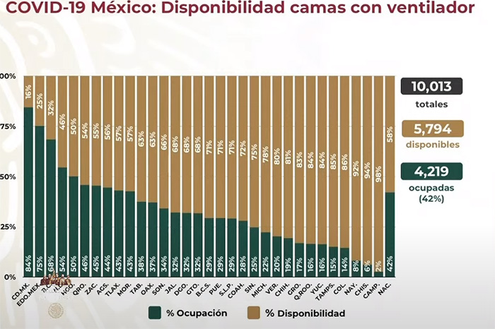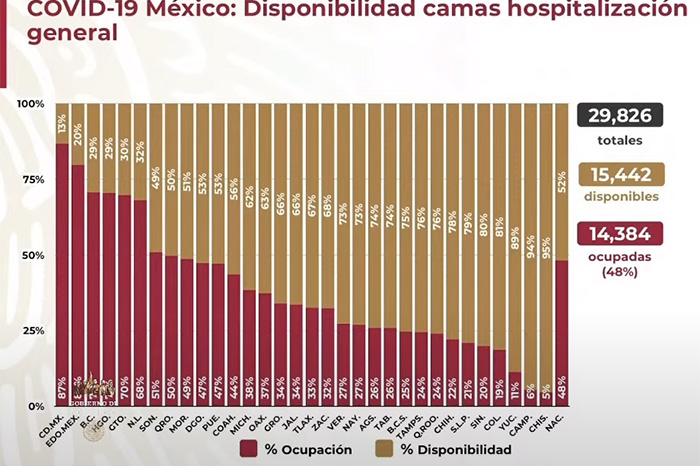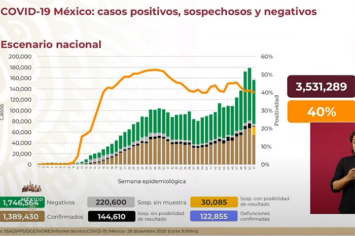 Redacción / La Voz de Michoacán Ciudad de México. Al corte epidémico de este lunes 28 de diciembre, México alcanzó la cifra de un millón 389 mil casos acumulados de COVID-19 y 122 mil 855 muertes a causa de esta enfermedad. Al reanudarse la conferencia vespertina de la Secretaría de Salud, las cifras sobre la epidemia en México señalan que 3 millones 531 mil 289 personas han sido clasificadas y estudiadas como casos sospechosos, de las cuales, a la gran mayoría se la ha tomado una muestra y de éstas, un millón 146 mil 564 han tenido un resultado negativo el virus. Actualmente se encuentra 30 mil 85 casos sospechosos con posibilidad de muestra, 220 mil 600 sin muestra y 144 mil 610 sin posibilidad de resultado. Sin embargo, tomando en cuenta los confirmados, los casos sospechosos y el porcentaje de positividad de 40%, se estima que la cantidad de contagios asciende a un millón 568 mil 565. Además, se calcula que 68 mil 726 pacientes enfermos mantienen la epidemia activa y 1,048,539 se han recuperado de la enfermedad. Sobre la infraestructura hospitalaria en cuanto a camas de hospitalización general, a nivel nacional se reporta una ocupación del 48% –15 mil 442 disponibles y 14 mil 384 ocupadas–; la Ciudad de México registra el mayor porcentaje de estos espacios ocupados, con el 87%. Y de camas con ventilador, hay una disponibilidad de 5 mil 794 de un total de 10 mil 13; también la capital del país tiene la menor disponibilidad, con apenas el 16%.