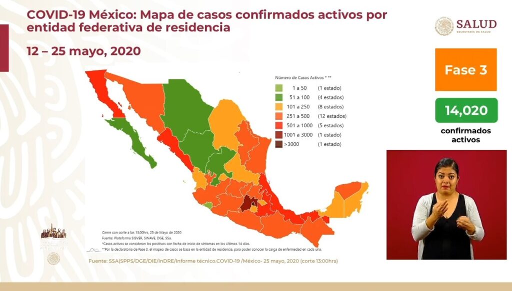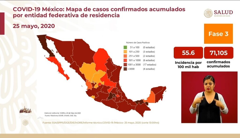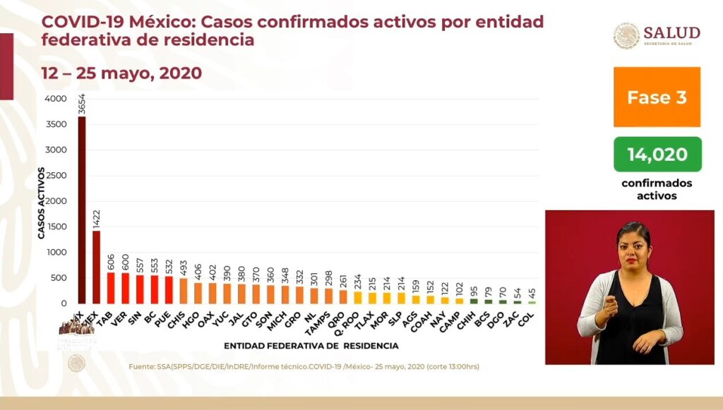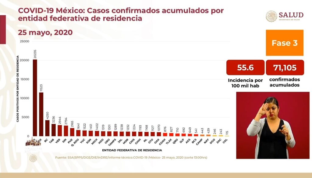 Osiris Olachea / La Voz de Michoacán Confirmados Curados Muertes México71.105.7.633CdMx20.235.51Edomex11.523.14Baja California4.250.7Tabasco3236.5Veracruz2.900.8 Ciudad de México. En las últimas 24 horas se registraron 239 defunciones por la enfermedad de COVID-19, que actualizan a 7 mil 633 el número total de muertes ocurridas en el país por complicaciones del padecimiento causado por el virus SARS-CoV-2, con lo que México llega al noveno lugar en el mundo con más fallecimientos, superando a Irán, que tiene 7 mil 451 contagios, de acuerdo con el conteo que realiza la Universidad Johns Hopkins. También en el último día se registraron 2 mil 485 contagios nuevos de COVID-19 en México, con lo que se alcanzaron los 71 mil 105 casos confirmados acumulados desde que inició la epidemia en el país, informó el doctor José Luis Alomía, director general de Epidemiología de la Secretaría de Salud federal (Ssa). De acuerdo con el Centro de Ciencia e Ingeniería de Sistemas de la Universidad de la Universidad Johns Hopkins, a nivel internacional México es el país número 17 con más casos confirmados del padecimiento, superando a Bélgica, Pakistán y Países Bajos. Fuente: Dirección General de Epidemiología. Diseño: Enrique Santiago, La Voz de Michoacán. Hasta hoy los casos activos son 14 mil 020, es decir, menos de una quinta parte de la enfermedad; como caso activo se consideran los pacientes que presentaron inicio de síntomas en las últimas dos semanas. La edad promedio de las personas que han dado positivo al nuevo virus es de 46 años y la mayoría son hombres, con 57 por ciento de los casos. Hasta hoy se han practicado pruebas de detección a 225 mil 650 personas, de las cuales 29 mil 509 se mantienen como casos sospechosos y 125 mil 036 han dado negativo. A solo unos días de que termine la Jornada Nacional de Sana Distancia la mayoría de los estados registra más de mil casos acumulados, mientras que solo 11 tienen menos de dicha cantidad, y de estos solo 5 tienen menos de 500 contagios. La tasa de prevalencia de la enfermedad respecto a los casos acumulados es de 55.6 por cada 100 mil habitantes y las entidades con más contagios positivos acumulados (es decir activos, recuperados y decesos) son: Ciudad de México (20,235)Estado de México (11,523)Baja California (4,250)Tabasco (3,236)Veracruz (2,944) Sin embargo, en cuando a los casos activos solo dos entidades tienen más de mil personas que aún presentan la enfermedad, mientras que la mayoría, 30 estados, tienen menos de mil casos. Las entidades con más casos activos (pacientes que iniciaron con síntomas en los últimos 14 días) hasta este este lunes son: Ciudad de México (3,657)Estado de México (1,422)Tabasco (606)Veracruz (600)Sinaloa (557) La tasa de incidencia nacional es de 10.9 por cada 100 mil habitantes, respecto a los casos activos, y los estados que ocupan los primeros lugares en este indicador son Ciudad de México, Tabasco, Sinaloa, Yucatán y Tlaxcala. Defunciones En cuando a las defunciones, los estados que reportan más muertes por complicaciones de la enfermedad de COVID-19 son Ciudad de México, Estado de México, Baja California, Tabasco y Sinaloa. Además de los 7 mil 633 fallecimientos de personas que dieron positivo a coronavirus, hay 641 más consideradas sospechosas, es decir, aún no se ha determinado si el paciente tenía el virus. La mayoría de las víctimas mortales de COVID-19 son hombres, con 68 por ciento de los decesos. La edad promedio de los fallecimientos en el país es de 60 años, pero el grupo de edad de 55 a 59 años es en el que se han registrado más muertes en hombres, mientras que en mujeres es de 60 a 69. Las principales comorbilidades, es decir enfermedades presentes en pacientes, en las defunciones por COVID-19 son hipertensión, diabetes y obesidad, seguidas de tabaquismo, insuficiencia renal crónica y enfermedad pulmonar obstructora crónica (EPOC). En cuando condición de caso, los pacientes hospitalizados intubados son los que más riesgo presentan, pues enfrentan 66 por ciento de letalidad. Fuente: Dirección General de Epidemiología. Diseño: Enrique Santiago, La Voz de Michoacán. Fuente: Dirección General de Epidemiología. Diseño: Enrique Santiago, La Voz de Michoacán.