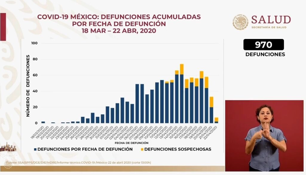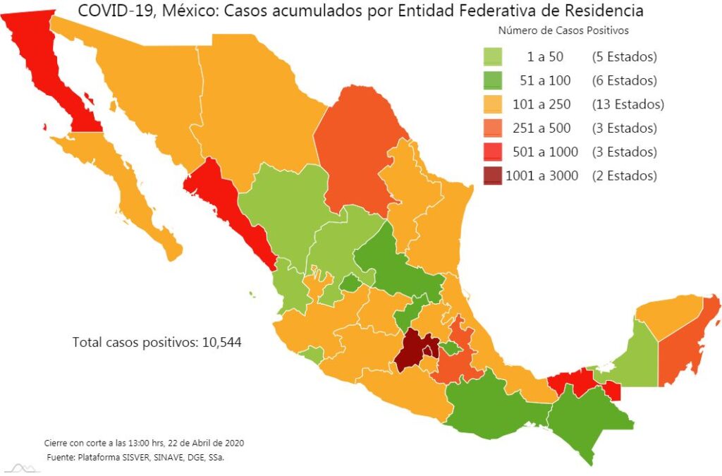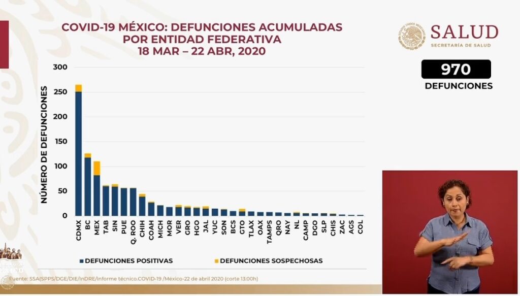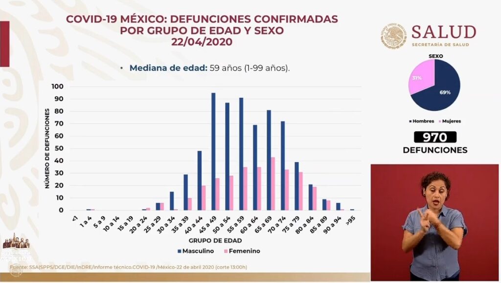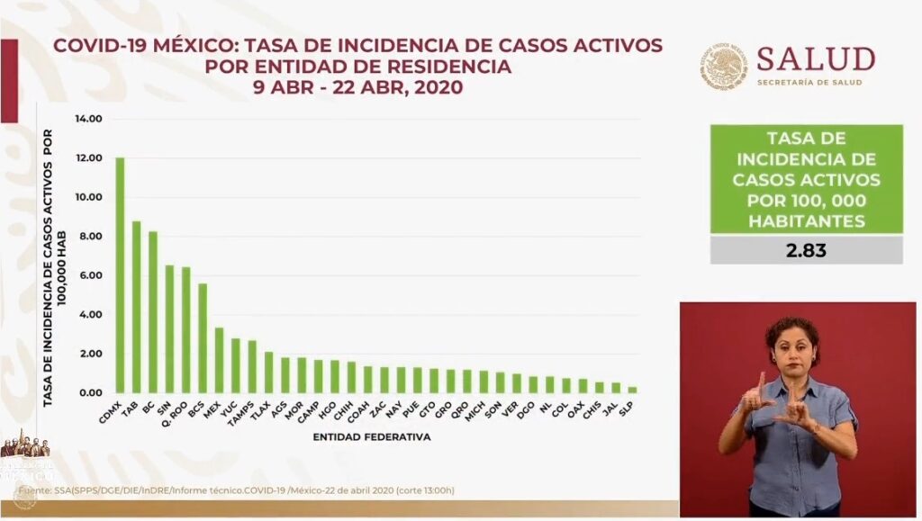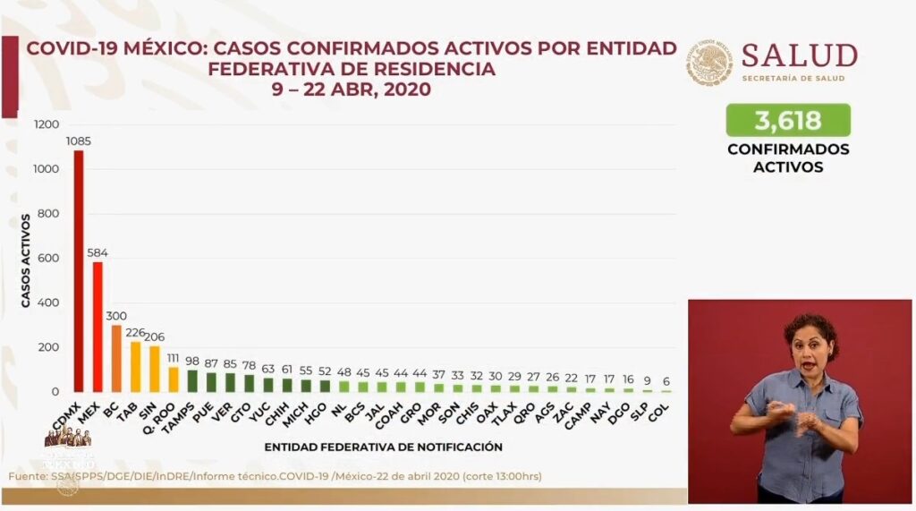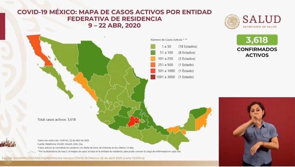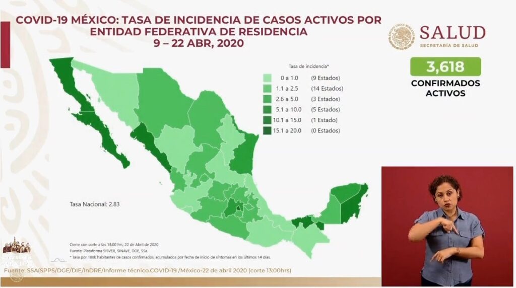 Redacción / La Voz de Michoacán Ciudad de México. En el último día se reportaron en México 1,043 contagios nuevos, así como 113 fallecimientos, con lo que el país llega a 10,544 casos confirmados acumulados, de los cuales 970 han muerto y 3,618 permanecen activos, el resto ya se ha recuperado, informó el subsecretario de Prevención y Promoción de la Salud de la Secretaría de Salud federal (Ssa), Hugo López-Gatell Ramírez. El funcionario explicó que los casos activos son los confirmados positivos que comenzaron con los síntomas de la enfermedad de COVID-19 en los últimos 14 días, y es en estos donde se centra la atención de las autoridades sanitarias para el tratamiento a la pandemia, pues son los que mantienen la transmisión. Fuente: Dirección General de Epidemiología. Diseño: Enrique Santiago y Elizabeth Zavala, La Voz de Michoacán. Las entidades que tienen más casos activos son la Ciudad de México (1,085), el Estado de México (584), Baja California (300), Tabasco (226), Sinaloa (206) y Quintana Roo (111). Por casos acumulados, los estados que registran más casos desde el inicio de la enfermedad en el país son la Ciudad de México (2,815), Estado de México (1,593), Baja California (985), Sinaloa (568) Tabasco (510), Puebla (388), Quintana Roo (432) y Coahuila (284). La tasa de incidencia nacional de casos activos es de 2.83 por cada 100 mil habitantes, y por entidad de residencia los estados que reportan más casos son Ciudad de México (12.03), Tabasco (8.78), Baja California (8.25), Sinaloa (6.52), Quintana Roo (6.44), Baja California Sur (5.59), Estado de México (3.35) y Tamaulipas (2.68). De las 970 defunciones que han ocurrido en el país, 69 por ciento son hombres y 31 por ciento mujeres, con una edad promedio de 59 años, pues la persona más joven en morir en el país era un menor de 1 año y la de mayor edad tenía 99 años. Fuente: DGE. Diseño: Enrique Santiago, La Voz de Michoacán. Fuente: DGE. Diseño: Enrique Santiago, La Voz de Michoacán.
