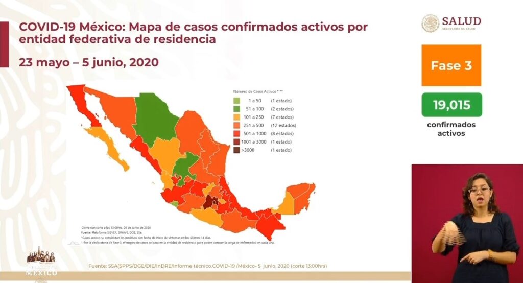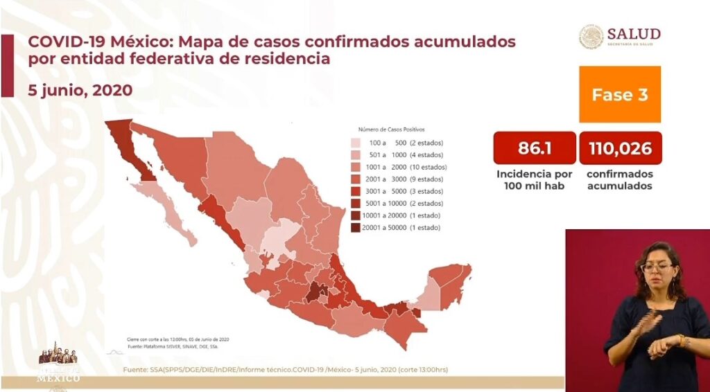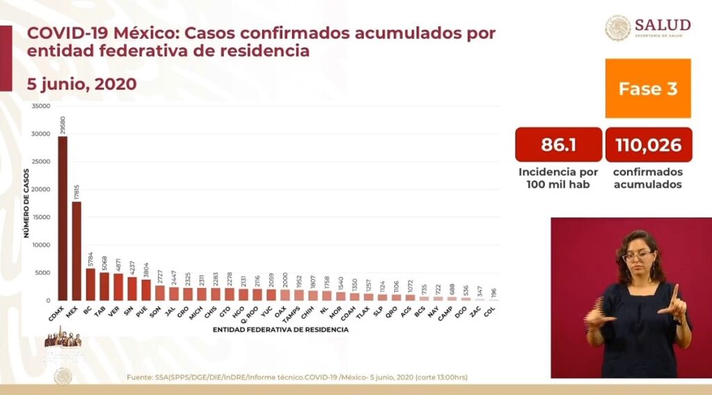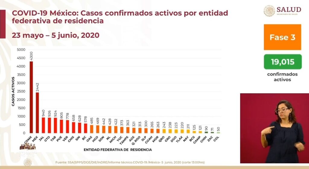 Osiris Olachea / La Voz de Michoacán Ciudad de México. Este viernes la Secretaría de Salud federal (Ssa) registró 4 mil 346 nuevos contagios de COVID-19, con lo que suman 110 mil 026 positivos en total en país, informó el director General de Epidemiología, José Luis Alomía Zegarra en la conferencia de prensa de este día. Hasta hoy han muerto 13 mil 170 personas por complicaciones de la enfermedad causada por el virus SARS-CoV-2, de las cuales 625 decesos se notificaron en las últimas 24 horas, aunque eso no significa que todas ocurrieron en ese lapso de tiempo, indicó el funcionario. Recordó que tanto los nuevos contagios como las defunciones dadas a conocer diariamente en Palacio Nacional son los casos confirmados por los estados en las últimas 24 horas, pero pudieron ocurrir días antes. De los más de 110 mil casos positivos de coronavirus en el país, solo 19 mil 015 continúan activos, de los cuales, 4 mil 300 le corresponden a la Ciudad de México, 2 mil 442 al Estado de México y 940 a Jalisco. Fuente: Dirección General de Epidemiología de la Secretaría de Salud. Diseño: Enrique Santiago, La Voz de Michoacán. El número de personas a las que se han practicado estudios para detectar si tienen el virus es de 324 mil 897, de las cuales 48 mil 822 continúan como sospechosos y 166 mil 049 obtuvieron un resultado negativo, es decir, no contrajeron el patógeno. La mayoría de casos acumulados se ubica en la zona conurbada del Valle de México (Ciudad de México-Estado de México) y Baja California. La incidencia calculada respecto a los casos acumulados es de 86.1 por cada 100 mi habitantes. La mayoría de los estados tienen entre mil y 3 mil positivos, seis entidades tienen menos de mil y siete tienen más de 3 mil. La capital mexicana reportó 29 mil 580 casos acumulados, 8 mil 358 sospechosos y 34 mil 669 negativos. En seguida, el Estado de México acumuló 17 mil 815 pacientes infectados, 8 mil 158 casos sospechosos y ha descartado el virus en 20 mil 837 personas. Baja California dio cuenta de 5 mil 784 contagios acumulados, mil 084 muestras en análisis y 3 mil 372 casos descartados. En cuanto a los casos activos, Jalisco escaló a la tercera posición con más contagios, al reportar 940, solo antes de la Ciudad de México (4,300 activos) y el Estado de México (2,442), que desde el inicio de la epidemia han concentrado la mayoría de casos. La tasa de incidencia actual respecto a los casos activos es de 14.9 por cada 100 mil habitantes, superior a la registrada hace dos semanas, que era de 10.4, de acuerdo con el corte presentado hoy. Los estados con la mayor incidencia de casos activos son Ciudad de México, Tabasco, Aguascalientes, Sinaloa, Quintana Roo y Yucatán. Defunciones De los 13 mil 170 fallecimientos por coronavirus en México, 3 mil 631 ocurrieron en la Ciudad de México, mil 531 en el Estado de México y mil 200 en Baja California. De acuerdo con el reporte nacional, con corte a las 13:00 horas de este viernes, en Veracruz, 721 personas han perdido la vida, 673 en Sinaloa, 626 en Tabasco, 525 en Puebla, 411 en Quintana Roo, 386 en Hidalgo, 376 en Chihuahua, 347 en Guerrero y 295 en Morelos. Dicho conteo, prosigue Michoacán con 220 muertes, 215 en Oaxaca, 213 en Jalisco, 207 en Yucatan, 183 en Tlaxcala, 176 en Chiapas, 165 en Sonora, 140 en Tamaulipas y 139 en Querétaro. Guanajuato dio cuenta de 134 decesos, Nuevo León de 109, Campeche de 103, Coahuila de 91, Nayarit de 81, San Luis Potosí 62, Durango 49, Aguascalientes 48 y Zacatecas 43. Por último, Baja California Sur contabilizó 41 fallecimientos, en tanto que Colima mantuvo la cifra en 29. Con información de Notimex Fuente: Dirección General de Epidemiología de la Secretaría de Salud. Diseño: Enrique Santiago, La Voz de Michoacán. Fuente: Dirección General de Epidemiología de la Secretaría de Salud. Diseño: Enrique Santiago, La Voz de Michoacán.