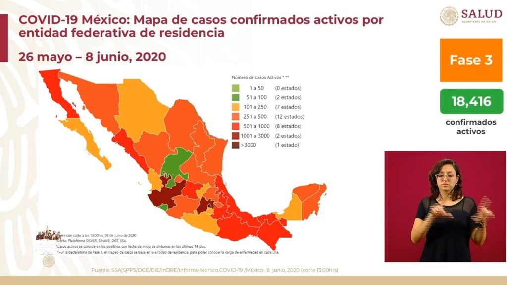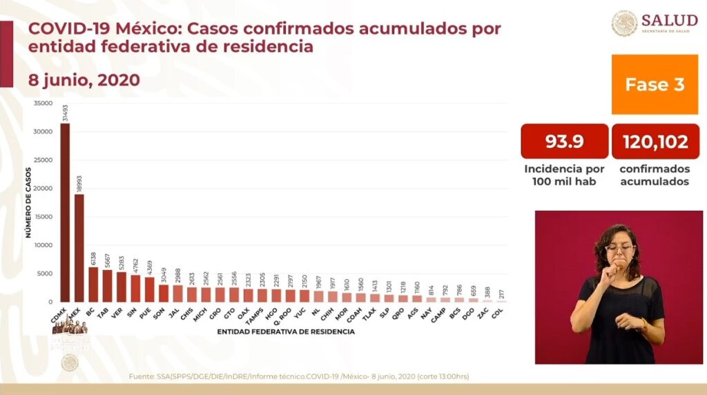 Ciudad de México. Este lunes México llegó a los 120 mil 102 casos confirmados de COVID-19, de los cuales 2 mil 999 se registraron en las últimas 24 horas, mientras que el número de personas que han fallecido por complicaciones de la enfermedad es 14 mil 053, y de estos decesos, 354 se notificaron en el último día, informó el doctor José Luis Alomía Zegarra, director general de Epidemiología de la Secretaría de Salud federal (Ssa).