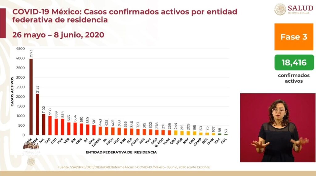 Con casos activos, es decir personas que aún presentan la enfermedad al manifestar inicio de síntomas en las últimas dos semanas, la mayoría de los estados tiene entre 100 y 500 habitantes enfermos y otras ocho entidades tienen más de 500 y menos de mil.