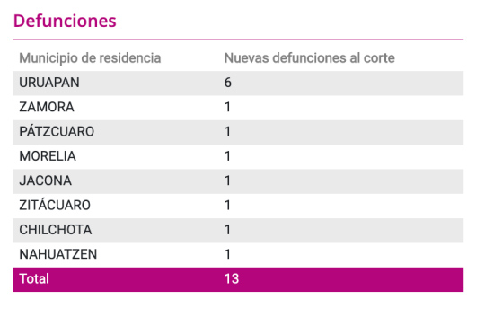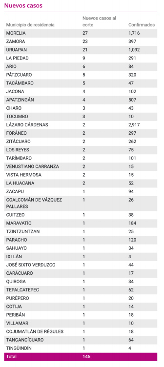 Casos acumuladosConfirmadosRecuperadosMuertesLázaro Cárdenas2,9172,588148Morelia1,7161,275120Uruapan1,09282994Huetamo49544632Apatzingán50742843Múgica35629353 La Voz de Michoacán te presenta todas las noches el último reporte de la Secretaría de Salud de casos de COVID-19 Juan Carlos Huante / La Voz de Michoacán Morelia, Michoacán. El estado de Michoacán cerró la semana con 11 mil 335 casos confirmados de COVID-19, con 145 nuevos registrados en las últimas 24 horas, 49 menos que los ocurridos de viernes a sábado. En decesos, con 13 más en un día, el estado suma una cifra total de 851. La capital michoacana es de nueva cuenta el municipio que registra la mayor cantidad de contagios recientes, con 27; seguido de Zamora, con 23; y Uruapan, con 21. Mientras que Lázaro Cárdenas, considerado el centro de la epidemia en el estado, sólo sumó 2 casos a su acumulado de 2 mil 917 personas que han enfermado por el coronavirus. De acuerdo con las cifras actualizadas al corte de este domingo, en total se han recuperado 8 mil 866 personas y se mantienen en estado sospechoso 2 mil 141, en tanto que los casos activos, foco de propagación del virus, se encuentran mil 618. En relación a contagios por grupos de edad, las personas entre 30 y 39 años son las más afectadas; a la fecha se registran mil 247 mujeres contagiadas y mil 407 hombres. Mientras que la mayor parte de los decesos ocurren en el rango de 60 a 69 años de edad, con un acumulado de 87 personas del género femenino y 152 del masculino. Ve aquí la situación de la epidemia en tu municipio En pérdidas de vida a causa de la enfermedad SARS-CoV-2 Uruapan reportó la mayor cantidad en un día, con 6, mientras que con un fallecimiento se encuentran Morelia, Pátzcuaro, Zamora, Jacona, Nahuatzen, Zitácuaro y Chilchota. La institución que más casos atiende por COVID-19 es la Secretaría de Salud de Michoacán (SSM), con el 68%, seguida del IMSS, con el 18.2%. Y con el mayor índice de muertes el Instituto Mexicano del Seguro Social registra el 41.2% y la SSM, 40.2%. En lo que lleva transcurrida la crisis sanitaria en Michoacán, se han aplicado 31 mil 603 pruebas de detección de COVID-19.