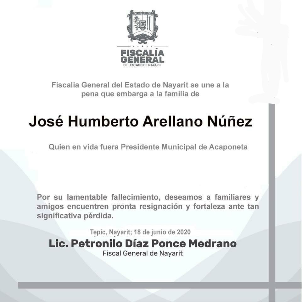 Jaime Humberto Arellano Nuñez, presidente municipal de Acaponeta, Nayarit, murió este jueves en Tepic a causa de las complicaciones generadas por COVID-19.