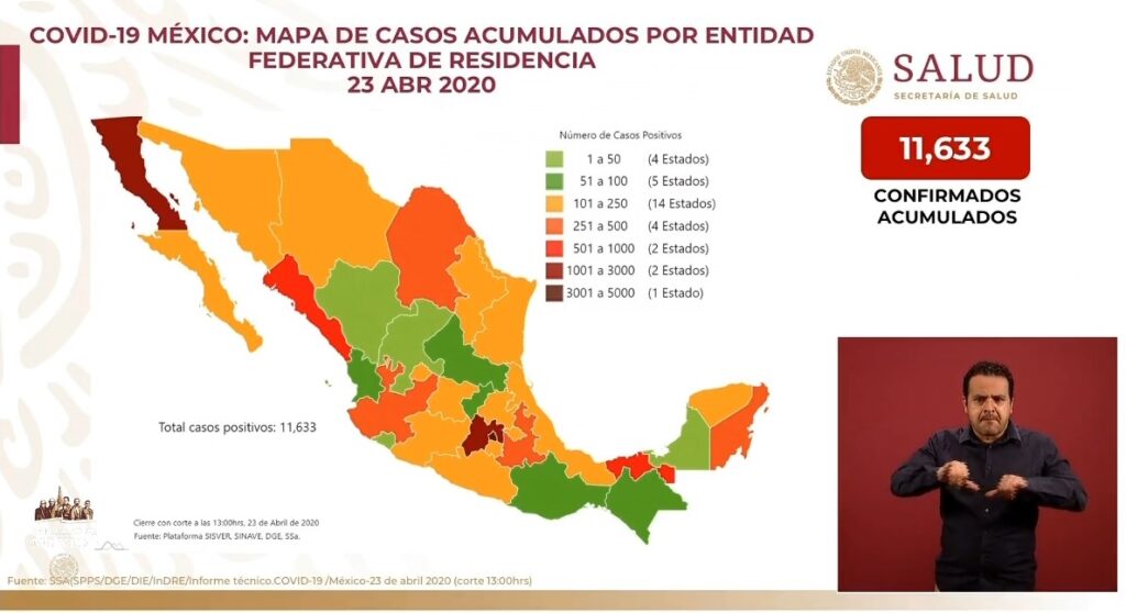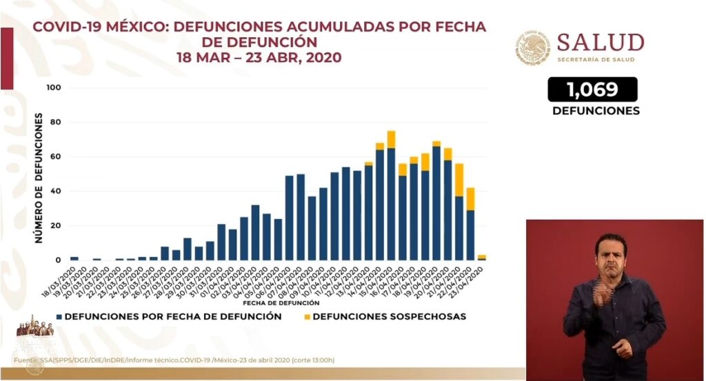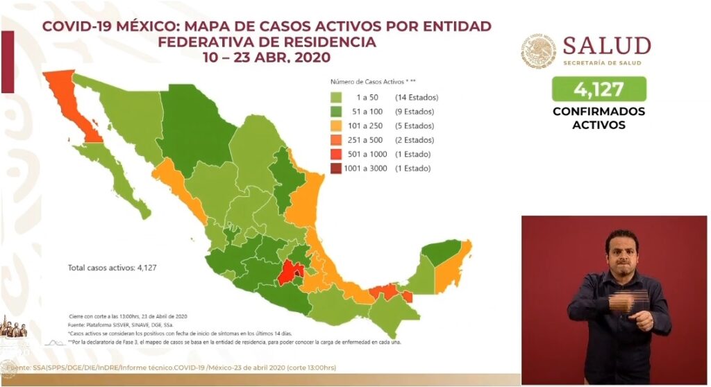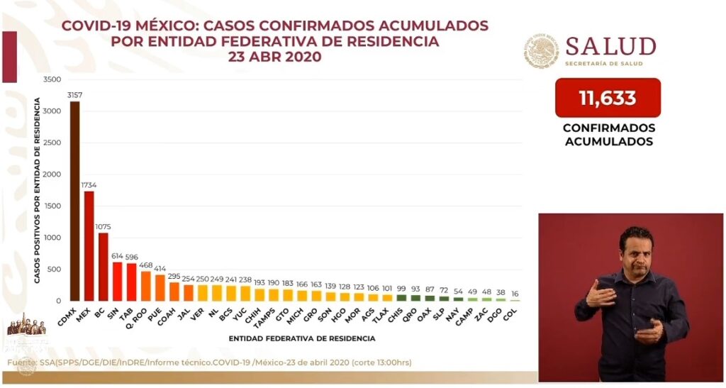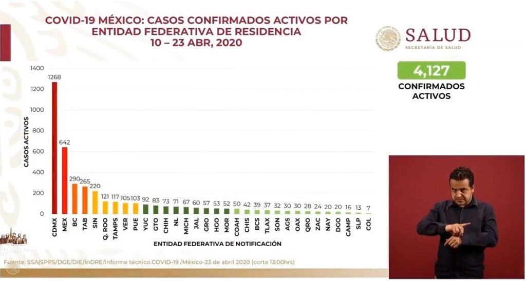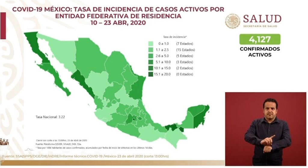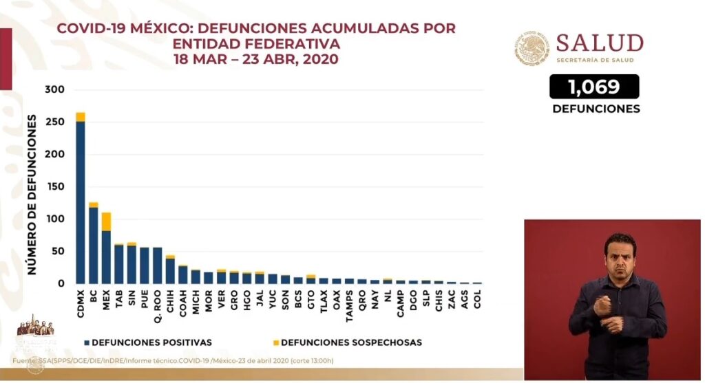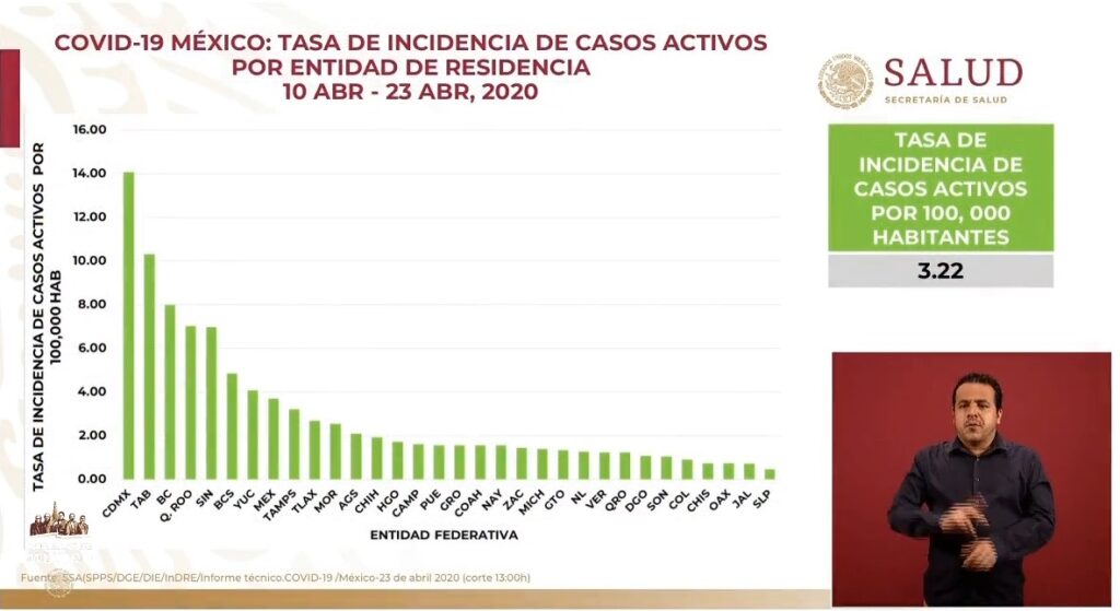 Redacción / La Voz de Michoacán Ciudad de México. Con 99 defunciones en el último día, México llegó a las 1,069 muertes por la enfermedad de COVID-19, mientras que los casos confirmados acumulados de la enfermedad suman 11,633, es decir, 1,089 más que las reportadas ayer, informaron autoridades de la Secretaría de Salud (Ssa) federal en la rueda de prensa desde Palacio Nacional. El director general de Epidemiología, José Luis Alomía, indicó que los casos activos confirmados son 4,127, es decir, personas que dieron positivo al virus del SARS-CoV-2 y que presentaron síntomas en los últimos 14 días. Los casos sospechosos acumulados son 7,588 y los negativos acumulados son 39,664 de un total de 58,885 personas estudiadas en el país. Fuente: Dirección General de Epidemiología. Diseño: Enrique Santiago y Elizabeth Zavala, La Voz de Michoacán. Por casos acumulados, los estados que tienen más casos desde que inició la pandemia en el país son la Ciudad de México (3,157), Estado de México (1,734), Baja California (1,075), Sinaloa (614), Tabasco (596), Quintana Roo (468), Puebla (414), Coahuila (295) y Jalisco (254). Por casos activos, es decir, personas que han manifestado síntomas en las últimas dos semanas, las entidades que reportan más casos son la Ciudad de México (1,268), Estado de México (642), Baja California (290), Tabasco (265), Sinaloa (220), Quintana Roo (121), Tamaulipas (117), Veracruz (105) y Puebla (103). La tasa de incidencia nacional de casos activos por cada 100 mil habitantes es de 3.22, y los estados con mayor tasa son Ciudad de México (14.05), Tabasco (10.3), Baja California (7.97), Quintana Roo (7.02), Sinaloa (6.96), Baja California Sur (4.84), Yucatán (4.07), Estado de México (3.68), Tamaulipas (3.2) y Tlaxcala (2.68). De las más de mil defunciones registradas hasta hoy en todo el país, la Ciudad de México es la que tiene más casos, seguida de Baja California, Estado de México, Tabasco, Sinaloa, Puebla, Quintana Roo, Chihuahua, Coahuila y Michoacán. Diseño: Enrique Santiago, La Voz de Michoacán. Diseño: Enrique Santiago, La Voz de Michoacán.