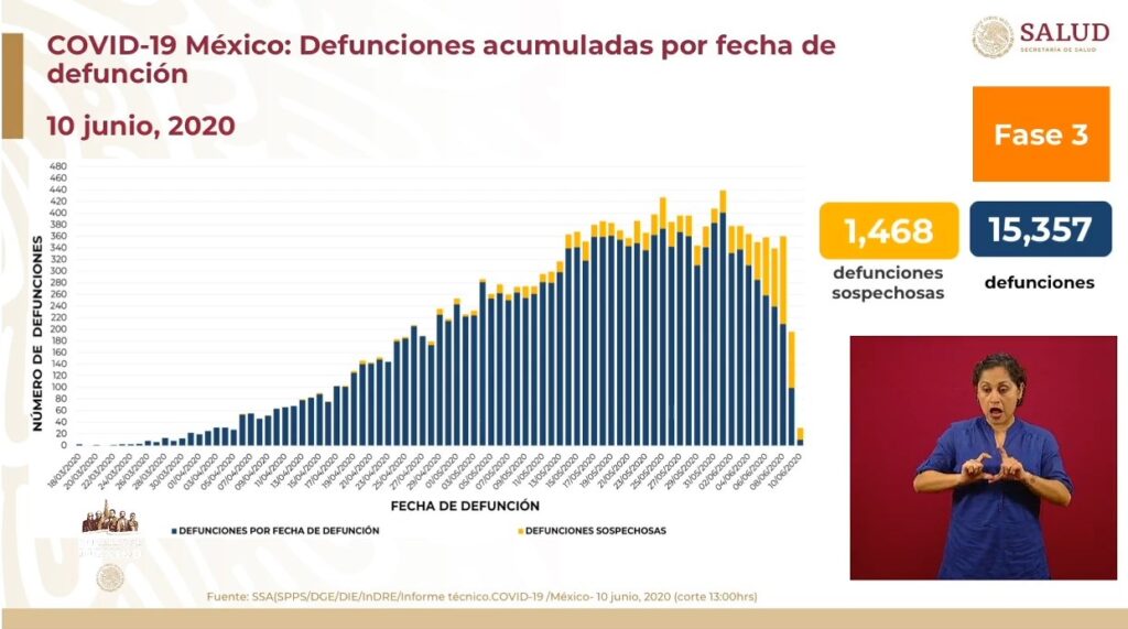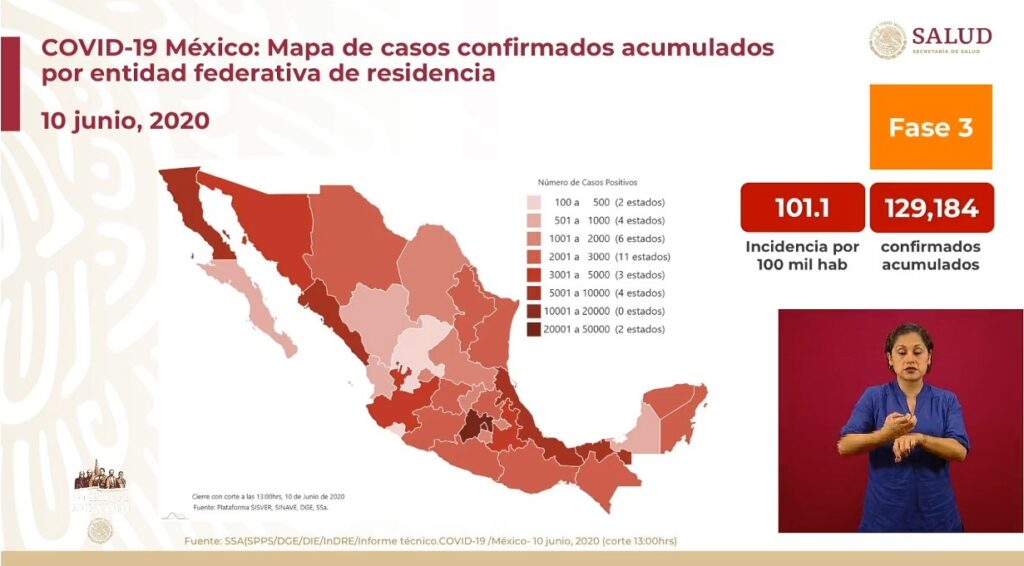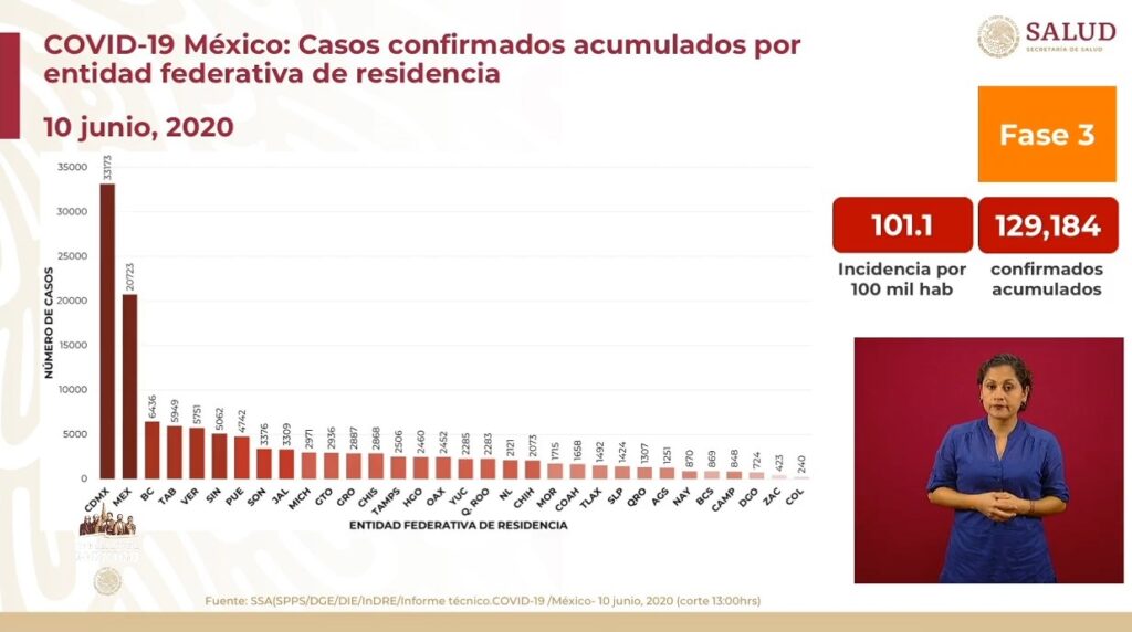 Osiris Olachea / La Voz de Michoacán Ciudad de México. Este miércoles México registró 4 mil 883 casos nuevos de personas positivas al virus SARS-CoV-2, causante de la enfermedad de COVID-19, con lo que el total acumulado de contagios es de 129 mil 184 en todo el país, informó el titula de la Dirección General de Epidemiología de la Secretaría de Salud federal (Ssa), José Luis Alomía. Además, hoy se notificaron 708 defunciones más ocurridas en los últimos días, pero que entre ayer y hoy fueron confirmadas positivas a coronavirus. Fuente: Dirección General de Epidemiología de la Ssa. Diseño: Enrique Santiago, La Voz de Michoacán. En el décimo día de la nueva normalidad y en la conferencia de prensa número 103, el director general de Epidemiología detalló que 19 mil 897 casos conforman la epidemia activa, ya que son pacientes que contrajeron el virus en los últimos 14 días y aún lo pueden transmitir. El funcionario recordó que las 32 entidades federativas se encuentran en semáforo rojo, es decir, en riesgo máximo de contagio del nuevo coronavirus. Explicó que hay mil 468 defunciones sospechosas y precisó que las 708 reportadas en las últimas 24 horas ocurrieron en fechas previas. La incidencia de la enfermedad es de 101.1 por cada 100 mil habitantes, calculada respecto a los casos acumulados, mientras que por casos activos la tasa de incidencia es de 15.6 por cada 100 mil habitantes. Sobre la ocupación hospitalaria, Alomía Zegarra apuntó que de las 23 mil 830 camas para atender COVID-19, 12 mil 878 mil están disponibles y 10 mil 952 mil están ocupadas, por lo que a nivel nacional la ocupación es de 46 por ciento. Alomía Zegarra detalló que en todo el país existen 8 mil 051 camas de cuidados intensivos o que cuentan con ventilador mecánico para soporte respiratorio, de éstas, 4 mil 930 están disponibles y 3 mil 121 ocupadas, el porcentaje de ocupación es de 39 por ciento. En camas generales, las entidades con mayor ocupación son Ciudad de México con 79 por ciento, le siguen Estado de México con 78 por ciento y Guerrero con 59 por ciento, mientras que en camas críticas Baja California tiene una ocupación de 62 por ciento, Ciudad de México 62 por ciento y Estado de México 61 por ciento. Sobre las defunciones, el director general de Epidemiología indicó que además de las 15 mil 357 personas que murieron por complicaciones de COVID-19, hay mil 468 decesos más catalogados como casos sospechosos, por lo que se está a la espera de que se determine si la causa de muerte está relacionada o no con coronavirus. Fuente: Dirección General de Epidemiología de la Ssa. Diseño: Enrique Santiago, La Voz de Michoacán. Fuente: Dirección General de Epidemiología de la Ssa. Diseño: Enrique Santiago, La Voz de Michoacán.