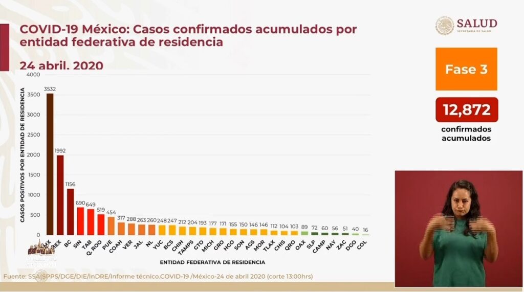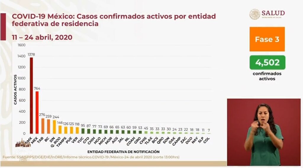 Osiris Olachea / La Voz de Michoacán Ciudad de México. Este viernes México registra 12 mil 872 casos confirmados acumulados de la enfermedad de COVID-19, de los cuales mil 221 han muerto y 4 mil 502 se mantienen con la enfermedad activa, informó el director general de Epidemiología de la Secretaría de Salud (Ssa) federal, José Luis Alomía. Esto representa un aumento de mil 239 contagios nuevos en el último día, así como 152 decesos, de acuerdo con el reporte emitido este día, con corte a las 13:00 horas. Los casos sospechosos acumulados llegaron a 7 mil 889, mientras que los negativos son 41 mil 573, de un total de 62 mil 334 personas estudiadas en todo el país. Fuente: Dirección General de Epidemiología. Diseño: Enrique Santiago y Elizabeth Zavala, La Voz de Michoacán. Por número de casos acumulados, es decir desde que comenzó el registro de pacientes con el virus de SARS-CoV-2 en México, las entidades que reportan más casos son: Ciudad de México (3,532)Estado de México (1,992)Baja California (1,156)Sinaloa (690)Tabasco (649)Quintana Roo (519) Siguen los estados de Puebla (454), Coahuila (317), Veracruz (288), Jalisco (263) y Nuevo León (260), con más casos acumulados. Por casos activos, es decir, los que manifestaron inicio de síntomas en las últimas 2 semanas, las entidades que tienen más personas con la enfermedad de COVID-19 aún presente son: Ciudad de México (1,378)Estado de México (764)Tabasco (276)Baja California (259)Sinaloa (244)Quintana Roo (146) La tasa de incidencia de casos activos en el país es de 3.52 por cada 100 mil habitantes. Las entidades con mayor tasa son: Ciudad de México (15.28)Tabasco (10.73)Quintana Roo (8.47)Sinaloa (7.73)Baja California (7.13)Aguascalientes (4.53) Defunciones De las mil 221 personas que han fallecido en México a causa de la enfermedad del COVID-19, la mayoría han ocurrido desde el 14 de abril a la fecha, además de que se reportan 77 muertes sospechosas de coronavirus, es decir, que aún no se determina el estado serológico del paciente que falleció y están en espera de resultados a la prueba del SARS-CoV-2, por lo que parte de estos casos podría sumarse al número total de muertes. Los estados que registran más fallecimientos son la Ciudad de México, Baja California, Estado de México, Sinaloa, Tabasco, Quintana Roo, Puebla y Chihuahua. También se tienen confirmados mil 934 casos de COVID-19 en personal de la salud. De ellos, 47 por ciento son médicos, 35 por ciento enfermeros, 15 por ciento otros profesionales sanitarios, uno por ciento laboratoristas y uno por ciento dentistas. Casos día por día Fuente: Dirección General de Epidemiología. Diseño: Enrique Santiago, La Voz de Michoacán. Fuente: Dirección General de Epidemiología. Diseño: Enrique Santiago, La Voz de Michoacán.