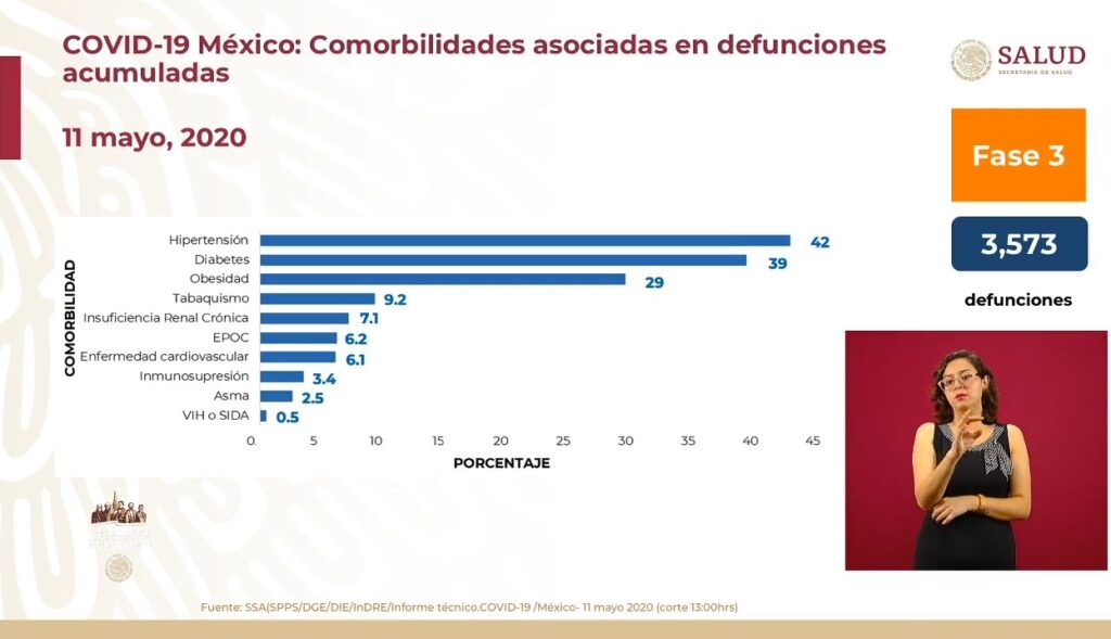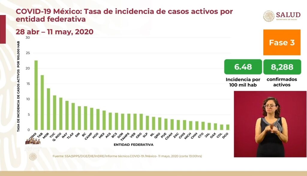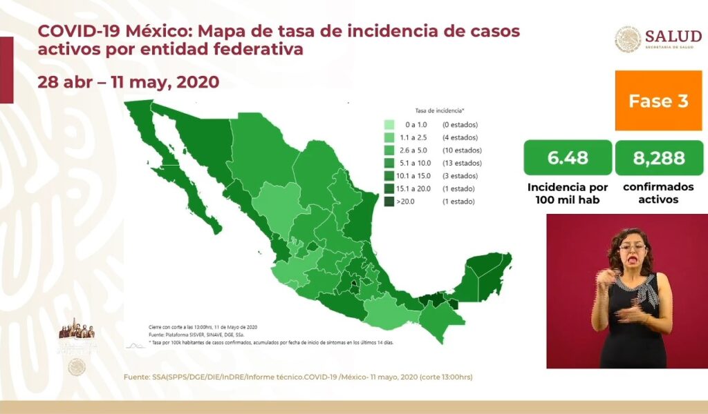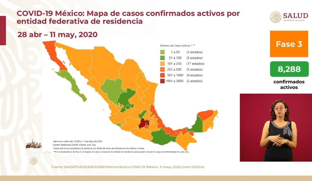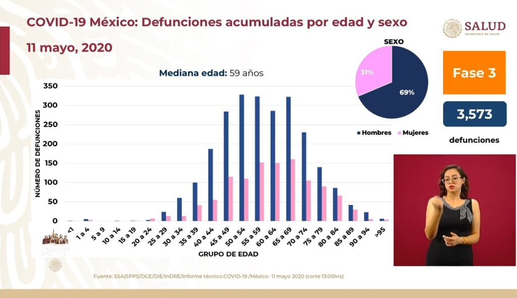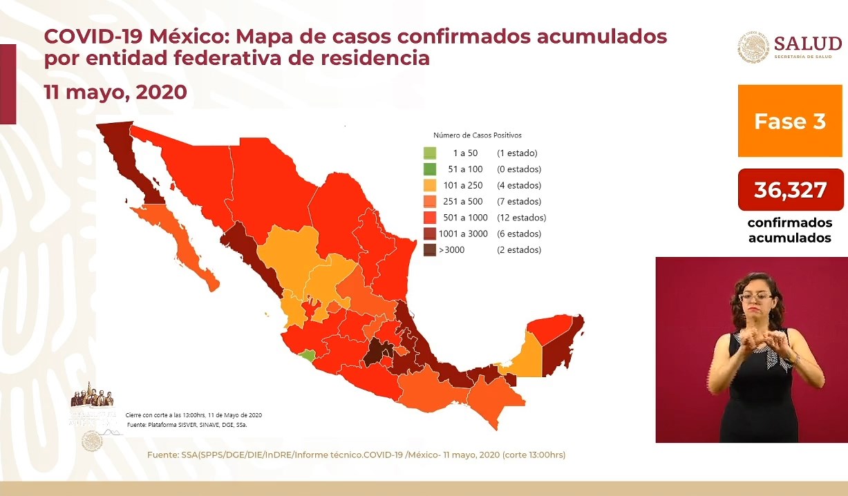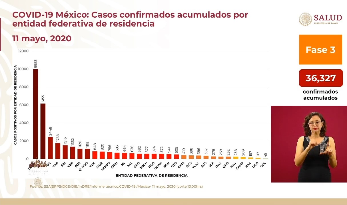 Osiris Olachea / La Voz de Michoacán Ciudad de México. Con mil 305 casos nuevos en el último día, México llegó a 36 mil 327 casos confirmados acumulados de la enfermedad de COVID-19, mientras que los decesos son ya 3 mil 573, de los cuales 108 ocurrieron entre ayer y hoy, informó el director general de Epidemiología, José Luis Alomía Zegarra. En la conferencia de prensa de la Secretaría de Salud (Ssa) federal para dar a conocer la actualización diaria de la enfermedad causada por la nueva cepa de coronavirus se informó que los casos activos son 8 mil 288, es decir, menos de la cuarta parte de todos los pacientes que han dado positivo al virus desde el inicio de la epidemia en México. Hasta hoy han sido estudiadas en el país 135 mil 116 personas, de las cuales 20 mil 991 se mantienen como sospechosos acumulados, mientras que 77 mil 798 han dado negativo a la prueba. Fuente: Dirección General de Epidemiología. Diseño: La Voz de Michoacán. De todos los pacientes que han dado positivo al virus del SARS-CoV-2, la mayoría son hombres, con 58 por ciento de los casos, mientras que la mujeres representan 42 por ciento, de acuerdo con la actualización presentada por el subsecretario de Salud, Hugo López-Gatell Ramírez. La mediana de edad de personas contagiadas es de 46 años y el grupo de 45 a 49 años es el que concentra más casos. Panorama general Los estados que tienen más casos acumulados, es decir, todos los pacientes positivos al virus, incluyendo recuperados, fallecidos y con la enfermedad activa, son: Ciudad de México (9,983))Estado de México (6,155)Baja California (2,448)Tabasco (1,758)Sinaloa (1,516) Sin embargo, los casos activos, es decir que manifestaron inicio de síntomas en las últimas dos semanas, representan solo 22.8 por ciento del total de positivos, y las entidades con más casos son: Ciudad de México (2,037)Estado de México (1,102)Tabasco (458) Veracruz (451)Baja California (280) La tasa de incidencia de casos activos en el país es de 6.48 por cada 100 mil habitantes, y los estados que tienen el mayor índice son: Ciudad de México (22.58)Tabasco (17.8)Morelos (13.55)Yucatán (11.24)Quintana Roo (10.5) Defunciones En todo el país 3 mil 573 personas han muerto por complicaciones relacionadas con la enfermedad de COVID-19, de acuerdo con el informe presentado esta noche por el subsecretario de Salud, Hugo López-Gatell. Además, 259 defunciones se mantienen como sospechosas, es decir, no se ha determinado si la causa del deceso fue el padecimiento causado por el virus SARS-CoV-2. La mayoría de las muertes han ocurrido en la Ciudad de México, Baja California, Estado de México, Tabasco, Sinaloa y Quintana Roo. La mayoría de las personas que han muerto a causa de COVID-19 presentaron hipertensión, diabetes y obesidad como principales comorbilidades, es decir, otros padecimientos que ya tenían cuando se contagiaron con el coronavirus. De los fallecidos, 69 por ciento son hombres y 31 por ciento mujeres, con una edad promedio de 59 años. Por edad, la mayoría de las muertes ocurrieron en personas entre 45 y 74 años. Casos día por día Fuente: Dirección General de Epidemiología. Diseño: La Voz de Michoacán. Fuente: Dirección General de Epidemiología. Diseño: La Voz de Michoacán. Fuente: Dirección General de Epidemiología. Diseño: La Voz de Michoacán.