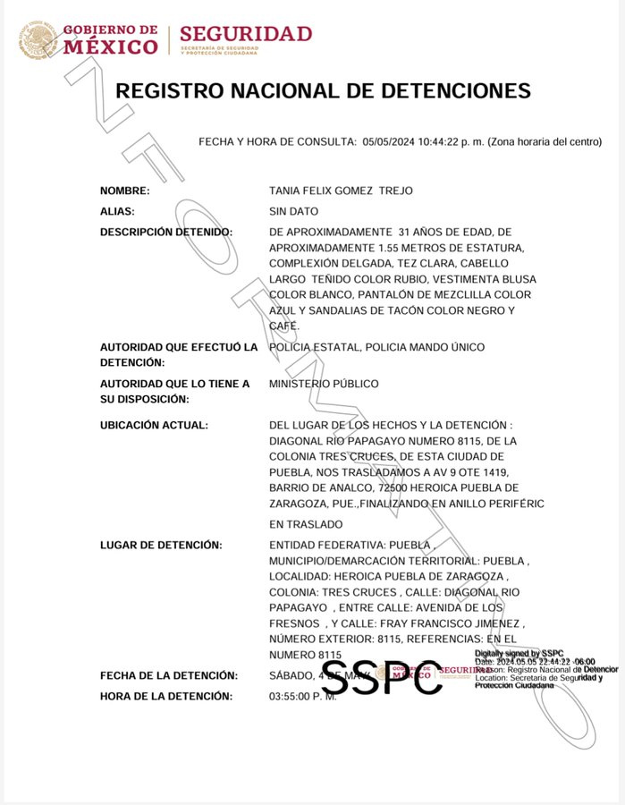 De acuerdo con el Registro Nacional de Detenciones, la detención de Gómez Trejo ocurrió el pasado sábado 4 de mayo, en un domicilio ubicado en Diagonal Río Papagayo, número 8115, de la colonia Tres Cruces, de la capital poblana, cerca de las 4 de la tarde.