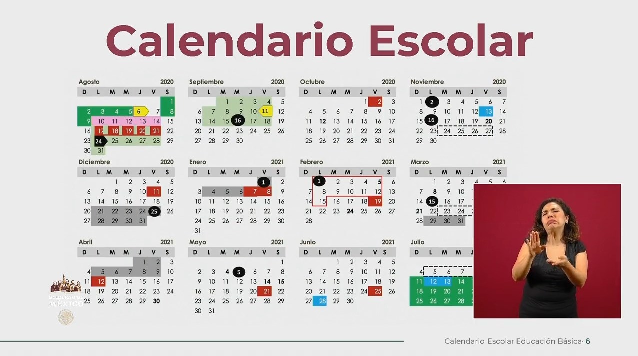 Osiris Olachea / La Voz de Michoacán Ciudad de México. El titular de la Secretaría de Educación Pública (SEP), Esteban Moctezuma Barragán, encabezó la conferencia de prensa del Gobierno de México para dar a conocer el Calendario Escolar del ciclo 2020-2021, que inicia este próximo 24 de agosto. El funcionario dio a conocer que mañana 6 de agosto inicia el periodo ordinario de inscripciones, que se extenderá de forma extraordinaria hasta el 11 de septiembre. Anunció que a partir de este ciclo escolar se incluyen en el calendario escolar algunos días para la descarga administrativa, previo a la entrega de boletas, pues dijo una de las principales solicitudes del magisterio ha sido tiempo para realizar estas labores. Moctezuma Barragán aclaró que tanto las escuelas públicas como las privadas seguirán el calendario dado a conocer este día, el cual prevé 190 días efectivos de clases. Como se anunció anteriormente, el inicio de clases será virtual y, una vez que los Semáforos de Riesgo COVID-19 de los estados estén en verde, los alumnos, docentes y personal administrativo volverán a los planteles para las clases presenciales, por lo que el ciclo escolar 2020-2021 será mixto o híbrido. Agosto 6 Inicia periodo ordinario de inscripciones.10 al 14 Capacitación magisterial.17 al 21 Consejo Técnico Escolar en línea para preparar el curso.24 Inicio del Ciclo escolar 2020-2021. Septiembre 11 Concluye periodo extraordinario de inscripciones.16 Día de asueto por el aniversario de la Independencia de México. Octubre 2 Día de Consejo técnico escolar, sin clases. Noviembre 2 Asueto por Día de Muertos.13 Día para descarga administrativa, sin clases.16 Día de asueto por aniversario de la Revolución Mexicana (20 de nov). 24 a 27 Entrega de boletas a padres de familia. Diciembre 11 Día de Consejo Técnico Escolar, sin clases.19 Inicio de vacaciones. Enero 7 y 8 Días de Consejo Técnico Escolar, sin clases.11 Reinicio de clases. Febrero 1 Asueto por el Día de la Constitución Mexicana (5 de febrero).19 Consejo Técnico Escolar, sin clases. Marzo 12 Día de descarga administrativa, sin clases.15 Asueto por el natalicio de Benito Juárez (21 marzo).23 al 26 Entrega de boletas de evaluación.29 Inicio de vacaciones de Semana Santa. Abril 12 Día de Consejo Técnico, sin clases.13 Reinicio de clases. Mayo 5 Asueto por aniversario de la Batalla de Puebla.21 Día de Consejo Técnico Escolar, sin clases. Junio 25 Día de Consejo Técnico escolar, sin clases.28 Día de descarga administrativa, sin clases. Julio 5 a 8 Entrega de boletas9 Concluyen las clases.12 y 13 Días de descarga administrativa. Harán conferencia diaria para resolver dudas El secretario de Educación Pública, Esteban Moctezuma Barragán, informó que todos los días hasta el 24 de agosto se realizará una conferencia de prensa desde Palacio Nacional a las 17:00 horas para resolver dudas sobre el próximo ciclo escolar. El funcionario aclaró que hay diálogo con los sindicatos para este retorno a clases y apuntó que continúa el proceso de capacitación magisterial.