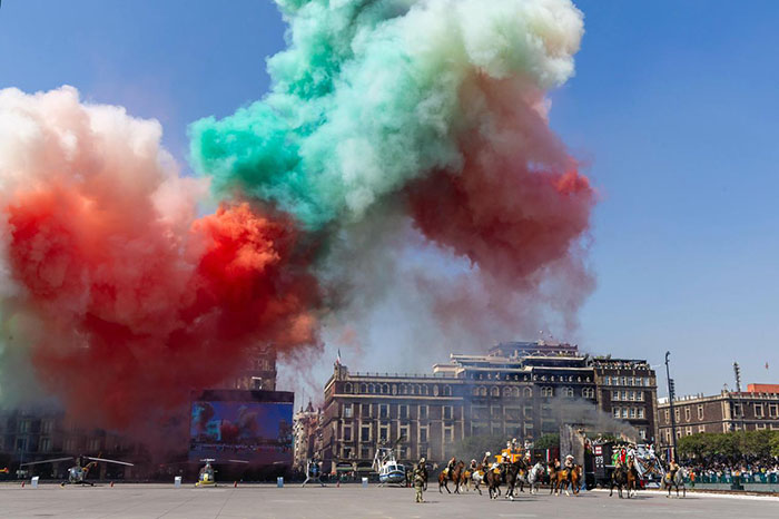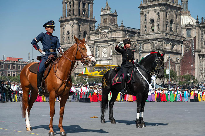 “Desfilaron ante el pueblo de México, una bandera monumental, cuatro estandartes de guerra, 2 mil 759 integrantes del Ejército y Fuerza Aérea Mexicanos, 19 deportistas, 100 charros, 44 civiles, 62 niños, 34 vehículos terrestres, nueve vehículos antiguos, 503 caballos, 23 aeronaves, tres águilas. Sin novedad”, refirió.