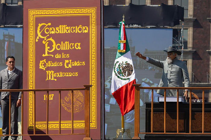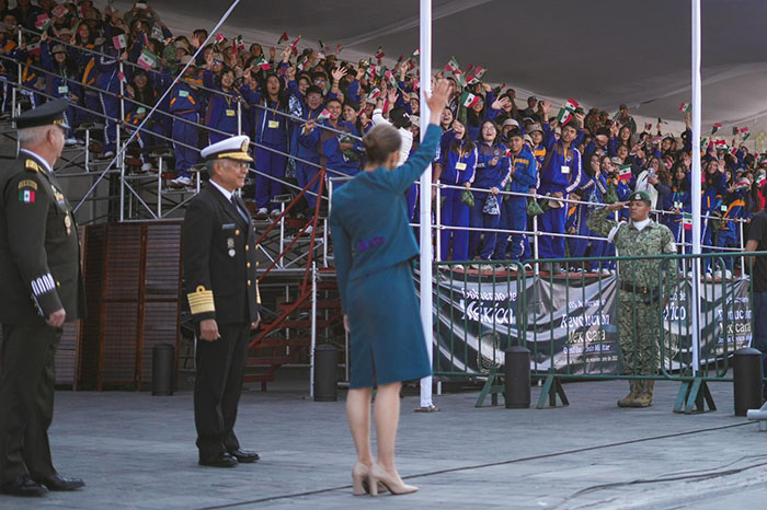 La Jefa del Ejecutivo Federal, acompañada por los secretarios de la Defensa Nacional, general Ricardo Trevilla Trejo, y de Marina, el almirante Raymundo Pedro Morales Ángeles, realizó el izamiento de la bandera monumental, asimismo pasó revista a las tropas. Como parte de la conmemoración, la Presidenta presenció la declamación “Lealtad: Ayer y Hoy” a cargo de dos cadetes del Heroico Colegio Militar, la escenificación de la Revolución Mexicana a cargo de mil 910 integrantes del Ejército, Fuerza Aérea y Guardia Nacional, así como de un popurrí de bailables revolucionarios por parte del Mariachi de la Secretaría de Defensa Nacional.