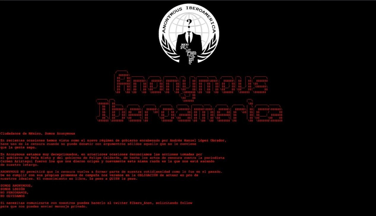 Redacción / La Voz de Michoacán Presuntos integrantes de Anonymus Iberoamérica hackearon esta mañana de lunes el portal del Consejo Nacional para Prevenir la Discriminación (Conapred) en protesta por las actuaciones del gobierno del presidente Andrés Manuel López Obrador, con el que se dijeron decepcionados. La Conapred ha estado en controversia pues su titular, Mónica Maccise, presentó su renuncia a fines de la semana pasada -- lo que aún estaría pendiente de concretarse por el respaldo del Consejo de esa institución y la mediación del subsecretario Alejandro Encinas-- frente a la intención del presidente de extinguirla, porque a su juicio no sirve, y además para ahorrar al dar sus atribuciones a la Secretaría de Gobernación. Hoy la página de la Conapred apareció con el mensaje: "hemos visto como el nuevo régimen de gobierno encabezado por Andrés Manuel López Obrador, hace uso de la censura cuando no puede debatir con argumentos (sic) sólidos aquello que no le conviene que la gente sepa. "En Anonymous estamos muy decepcionados, en anteriores ocasiones denunciamos las acciones tomadas por el gobierno de Peña Nieto y del gobierno de Felipe Calderón, de hecho los actos de censura contra la periodista Carmen Aristegui (sic) fueron los que nos dieron origen y nuevamente esta misma razón es la que nos está sacando de nuestro letargo.