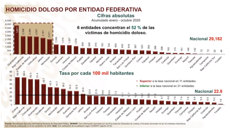 EFE / La Voz de Michoacán Ciudad de México. El Gobierno mexicano registró un aumento mensual de 7,72% en los homicidios dolosos en octubre al reportar 2.944 víctimas frente a las 2.733 en septiembre, informó este jueves la Secretaría de Seguridad y Protección Ciudadana (SSPC). Con estos resultados, México acumula 29.182 homicidios en lo que va del año, un incremento anual de 1,1%, con una tasa de 22,8 de estos crímenes por cada 100.000 habitantes, reveló Mejía al presentar el informe mensual en el Palacio Nacional. El reporte mostró que tan solo seis estados concentran un 52% de los homicidios, con el central estado de Guanajuato a la cabeza, seguido de Baja California, Estado de México, Chihuahua, Jalisco y Michoacán. Además, añadió la SSPC, 15 municipios aglutinan más de una cuarta parte de los asesinatos: Tijuana, Ciudad Juárez, León, Celaya, Culiacán, Cajeme, Zamora, Guadalajara, Acapulco, Chihuahua, Cancún, Irapuato, Ensenada, Salamanca y Morelia. Se frenó el crecimiento exponencial que venía desde el 2015 a la fecha, se frenó el crecimiento desde el inicio de la Administración y seguimos en la línea de contención con un muy pequeño incremento del mes de septiembre al mes de octubre", afirmó Ricardo Mejía, encargado de despacho de la SSPC. México se acerca a su récord histórico de 2019, cuando registró 34.608 homicidios dolosos y 1.012 víctimas de feminicidio. Mientras estos crímenes han disminuido en 21 estados del país, han crecido en los otros 11. La secretaría también reportó en octubre 76 feminicidios. Aunque Mejía argumentó que esto es una reducción del 3,8 % frente a los 79 feminicidios de septiembre, también reportó un acumulado de 801 víctimas en lo que va del año, lo que representa un incremento anual del 1,5%. Del pico que tuvimos ya hay una tendencia a la baja", insistió el encargado de la SSPC. La secretaría presumió una disminución del 22,2% anual en los delitos del fuero federal, con 65.672 registrados hasta octubre. De los 11 crímenes dentro de este catálogo, solo han aumentado en un 49,5 % los relacionados con delincuencia organizada. También resaltó una disminución en 15 de los 18 delitos de alto impacto, que incluyen reducciones del 36,5% en secuestros, el 23,8% en robo a transeúnte y el 21,7% en robo total. Además de feminicidio y homicidio, el único otro crimen de alto impacto que se ha incrementado es el de violencia familiar, en un 3,4%, observó Mejía. Pese al panorama, el encargado de la SSPC aseveró que desde el inicio de la presidencia de Andrés Manuel López Obrador, en diciembre de 2018, hay "una tendencia marcada a la baja" en los delitos federales. Viene desde antes de la pandemia porque algunos críticos han dicho 'es que bajaron los delitos porque está el tema de la pandemia'. No, ya venía desde antes y se sigue manteniendo la tendencia a la baja", defendió.