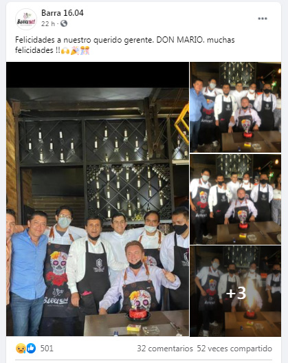 En la página de Facebook del restaurante, ubicado en Salamanca, Guanajuato, se felicitó a Mario Alberto Hernández Cárdenas, gerente del lugar, publicación que fue acompañada de 6 fotografías del momento del festejo.