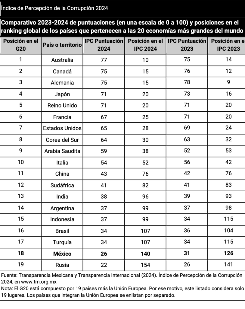 Redacción / La Voz de Michoacán Transparencia Internacional ha colocado a México en el peor puesto de su historia en el Índice de Percepción de Corrupción. La organización, que elabora su informe cada dos años, ubica al país en 2024 en la posición 140 de 180 países evaluados, a la altura de Irak, Uganda o Nigeria. Dentro de los 100 puntos posibles, que suponen la calificación máxima, México obtuvo 26. Esto supone un retroceso con respecto a 2022, cuando el país registró 31 puntos y se situó en el puesto 126. “Los resultados confirman el mandato de la sociedad mexicana: el Gobierno debe enfrentar con mayor eficacia la corrupción en México”, ha escrito en su comunicado Transparencia Mexicana, recogido por el diario El País. Los niveles de corrupción son “extremadamente elevados” en todo el mundo, concluye el último informe de Transparencia Internacional, que recalca que dos de cada tres países están por debajo de los 50 puntos. Dinamarca (90), Finlandia (88) y Singapur (84) encabezan el ranking que cierran Sudán del Sur (8), Somalia (9) y Venezuela (10). En la región americana, solo Uruguay (76), Canadá (75), Estados Unidos (65), Chile (63) y Costa Rica (58) consiguen el aprobado. México ha sufrido el peor descenso del continente en la lucha contra la corrupción, ya que ha caído cinco puntos en solo dos años. El país queda mejor evaluado que Guatemala (25), Paraguay (24), Honduras (22), Haití (16) y Nicaragua (14), pero peor que Cuba (41), Colombia (39), Argentina (37), Brasil (34), Ecuador (32), Perú (31) o Bolivia (28). Transparencia Internacional insiste en que los resultados para el país se basan en información de 13 “fuentes independientes” entre 2023 y 2024: “Al integrar distintas mediciones y dos años en una sola estimación, se evita que un solo evento o escándalo de corrupción altere la calificación de un país. Lo que mide es la tendencia y no casos específicos”. Este Índice de Percepción de Corrupción ha sido usado como referente hasta por Andrés Manuel López Obrador, quien lo nombró en 2018 en su primer mensaje como presidente de México: “Según la última medición de Transparencia Internacional ocupamos el lugar 135 en comparación con 176 países evaluados. Ocupamos el lugar 135 en corrupción, entre 176 países evaluados y pasamos a ese sitio luego de estar en el lugar 59 en el 2000, subir al 70 en el 2006, escalar al 106 en el 2012 y llegar en 2017 a la vergonzosa posición en que nos encontramos”. Durante la mayor parte de la Administración de López Obrador, el país mejoró su posición con respecto a años anteriores (aunque nunca llegó al nivel de 2014), sin embargo, ha sido en este último tramo cuando la percepción de corrupción se ha incrementado. La ONG enlista cinco claves para entender el resultado. El primero es la “incertidumbre sobre el alcance y la implementación de las reformas en materia de transparencia, anticorrupción y sobre el Poder Judicial”. También se incluye “el creciente número de casos de corrupción a nivel estatal que involucran al crimen organizado” y el aumento de “empresas identificadas como fantasma o controladas por el crimen organizado que siguen siendo contratadas por los gobiernos”. Además, recupera los “bajos niveles de sanción en materia de responsabilidades administrativas”: “De acuerdo con Transparencia Mexicana, utilizando información proporcionada por las propias agencias fiscalizadoras, de las 3 mil 350 posibles responsabilidades administrativas iniciadas por los 33 órganos de fiscalización superior entre 2017 y 2024, 281 casos (8.4%) terminaron en sanción por parte de tribunales administrativos”. Por último, Transparencia Internacional insiste en la “impunidad” de casos como Odebrecht, Pemex Agronitrogenados, la llamada Estafa Maestra y Selgamex. Sobre el entramado en la extinta agencia federal a cargo de la seguridad agroalimentaria, incide en que hay 26 personas vinculadas a proceso penal: “Pero no han sido encontradas como responsables por un juez. Las sentencias están aún pendientes”. A nivel global, Transparencia Internacional hace hincapié en la fuerte relación que hay entre la corrupción y la crisis climática: “Dos de los mayores retos a los que se enfrenta la humanidad están fuertemente entrelazados”. “La corrupción debilita las estructuras de gobernanza, socava el cumplimiento de la ley y desvía financiación climática esencial destinada a reducir las emisiones y aumentar la resiliencia”, afirma la organización, “en los países donde la corrupción es generalizada, la transparencia en la toma de decisiones medioambientales suele verse comprometida, lo que conduce a resultados injustos y a la destrucción de los recursos naturales”.
