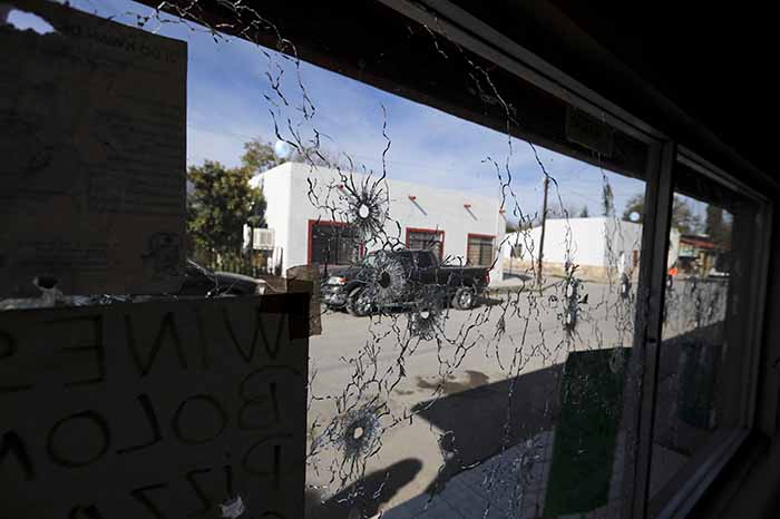 La ventana de un negocio ubicada cerca del ayuntamiento del pueblo de Villa Unión, Mexico, aparece llena de hoyos de balas tras un tiroteo, el lunes 2 de diciembre del 2019. (AP Foto/Eduardo Verdugo)