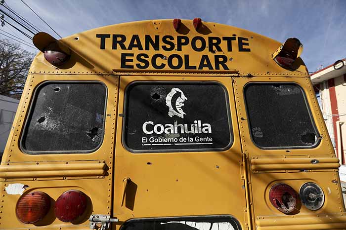 Agujeros de bala pueden apreciarse en un autobús escolar frente al ayuntamiento de Villa Unión, México, tras un tiroteo, el lunes 2 de diciembre del 2019. (AP Foto/Eduardo Verdugo)