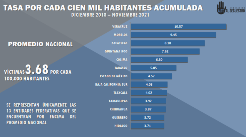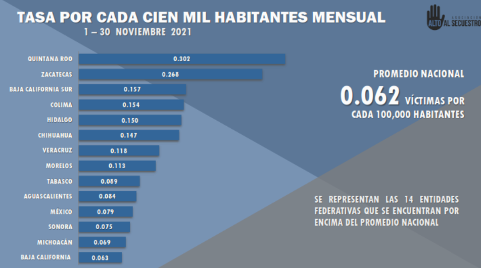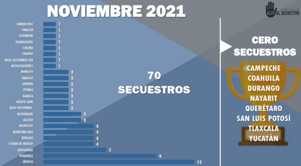 EFE / La Voz de Michoacán Ciudad de México. El número de víctimas de secuestro en México ascendió a 102 en noviembre, un incremento mensual de 10.8% frente a las 92 de octubre, informó este martes la asociación civil Alto al Secuestro. "(Hubo) un incremento de 69 % en el número de detenidos relacionados al delito de secuestro, debido a que en noviembre fueron detenidas 120 personas por este delito mientras que en octubre fueron detenidos 71 presuntos responsables", detalló la organización en su informe mensual. Aun así, la asociación registró una disminución de 7.8% en las carpetas de investigación iniciadas por las autoridades por el delito de secuestro. Mientras que en noviembre contabilizó 70 carpetas frente a las 76 de octubre. Además, la organización documentó 27 secuestros que quedaron registrados en los medios de comunicación, pero que las autoridades "indebidamente no integraron en carpetas de investigación". Los estados con mayor incidencia de ese delito en el undécimo mes del año fueron Estado de México con 12 casos, Veracruz con 9 y Chihuahua con 5. Por otro lado, hubo ocho estados que no registraron ningún secuestro en noviembre: Campeche, Coahuila, Durango, Nayarit, Querétaro, San Luis Potosí, Tlaxcala y Yucatán. Según Alto al Secuestro, desde el inicio de la presidencia de Andrés Manuel López Obrador, en diciembre de 2018, México ha contabilizado 4.139 secuestros. Esta cifra es 40.4% menor a los 6 mil 947 secuestros que hubo en el mismo lapso de mandato de su antecesor, Enrique Peña Nieto (2012-2018). Pero la incidencia de este crimen es 68.1% mayor a los 2 mil 462 plagios del mismo periodo del expresidente Felipe Calderón (2006-2012). Con base en las cifras del mandato de López Obrador, Alto al Secuestro estableció que en México ocurren 115 secuestros mensuales, 27 semanales y 4 diarios. Desde el inicio del mandato de López Obrador, la organización ha contabilizado mil 887 raptos en 2019, mil 151 en 2020 y 922 en lo que va de 2021. En los primeros 11 meses de 2021 ha habido una reducción de 13.9% en el número de delitos en comparación con la misma etapa de 2020, cuando hubo mil 072 México ha registrado los dos años más violentos de su historia durante los primeros dos años del presidente Andrés Manuel López Obrador, con 34.689 víctimas de asesinato en 2019 y 34 mil 558 en 2020.