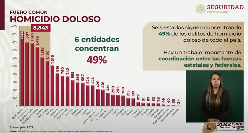 Redacción / La Voz de Michoacán Tijuana. Rosa Icela Rodríguez, secretaria de Seguridad y Protección Ciudadana, dio a conocer que seis estados siguen concentrando el 49 por ciento de los delitos de homicidio doloso de todo el país. Guanajuato, con mil 864; Michoacán, mil 587; Baja California, mil 567; Estado de México, mil 475; Jalisco, mil 218 y Chihuahua, mil 132; suman tan sólo 8 mil 843 casos. En Michoacán, Icela Rodríguez dijo que se ve una disminución de casos en los últimos 4 meses. Durante el informe mensual de seguridad, Rosa Icela Rodríguez informó que el homicidio doloso mantiene una tendencia a la baja con una reducción de 8.7% en 2022 con respecto a 2021 (en el periodo enero-julio). La secretaria de Seguridad y Protección Ciudadana aseguró que, al inicio de la actual Administración, se cometían 9 mil 62 delitos del fuero federal y presume que en julio de 202 se registraron 29.3% menos incidencias.