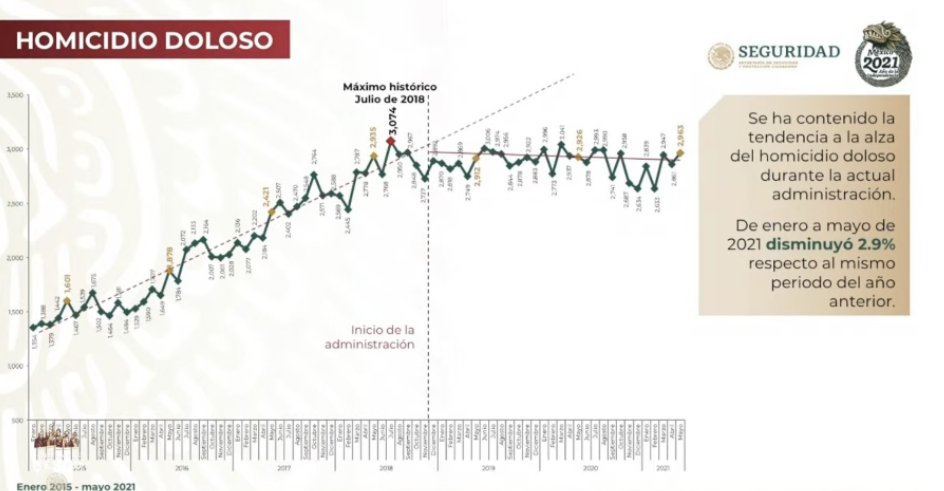 EFE / La Voz de Michoacán Ciudad de México. México reportó 2,963 homicidios en mayo, por lo que se convierte en su mes más violento en lo que va de 2021 y uno de los 10 más sangrientos del sexenio de Andrés Manuel López Obrador, informó este lunes la Secretaría de Seguridad y Protección Ciudadana (SSPC). La cifra es un incremento mensual de 3.57% frente a los 2,861 asesinatos reportados en abril y un aumento anual de 1.26% ante los 2,926 registrados en mayo del año pasado. Aun así, la titular de la SSPC, Rosa Icela Rodríguez, presumió de una reducción anual de 2.9% en el número de homicidios dolosos en los primeros cinco meses del año. La secretaria argumentó que solo seis estados concentran 50.4% de los homicidios: Guanajuato, Baja California, Jalisco, Estado de México, Michoacán y Chihuahua. También indicó que los 15 municipios de atención prioritaria, que acumulan 27% de los asesinatos nacionales, han mostrado una caída de 6.1% en lo que va del año. Asimismo, señaló que en 6 municipios, León, Cajeme, Acapulco, Guadalajara, Chihuahua y Morelia, se incrementó este delito 19.6%. "Se sigue conteniendo la tendencia al alza del homicidio doloso durante la presente Administración", aseveró la secretaria en la rueda de prensa matutina del presidente. México ha registrado los 2 años más violentos de su historia en los primeros dos años del Gobierno de López Obrador con 34,682 víctimas de asesinato en 2019 y 34,554 en 2020. En contraste, Rodríguez admitió aumentos en lo que va de 2021 de 30% para el delito de violación, 47% para la trata de personas y de 7% en feminicidios, asesinatos de mujeres por razones de género. En esta ocasión, a diferencia de otros reportes, la secretaria no precisó el número de feminicidios en mayo. También enunció incrementos del 8% en delitos contra la salud (relacionados con la droga), de 8.1% en crímenes cometidos por servidores públicos y de 137.7% en delitos electorales, por ser año electoral. Por otro lado, titular de la SSPC destacó una caída de 5.8% en lo que va del año de robos en general, un crimen que ha decrecido 22.7% en la presente administración. Asimismo, expuso una reducción de 28.8% en los secuestros en este 2021. "Los delitos (en general) han disminuido 27.2% en enero a mayo de 2021, respecto al mismo periodo de 2019, lo que representa una tendencia a la baja desde el inicio de la administración", aseveró. En la rueda de prensa matutina, el comandante Luis Rodríguez Bucio presumió de una fuerza operativa de la Guardia Nacional de casi 100,000 personas, de las que cerca de 85,000 ya están desplegadas. En tanto, el secretario de Marina, José Rafael Ojeda, detalló el despliegue de más de 142,000 soldados y marinas. De estos elementos, hay más de 27,000 en la frontera norte y sur que han "rescatado" a casi 23,000 migrantes, ahondó Luis Cresencio Sandoval, jefe del Ejército.