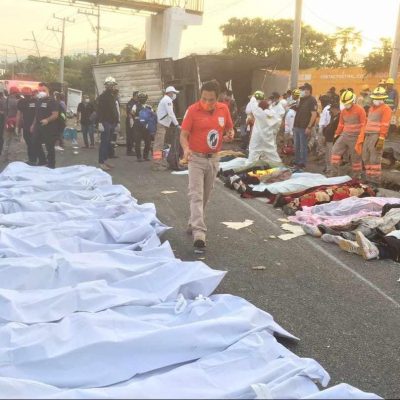 Según el reporte de la Fiscalía de Chiapas, el tráiler chocó con la pared del muro de un puente peatonal, tras impacto la caja quedó sin el techo para luego volcarse hacia un costado y a consecuencia del choque decenas de migrantes murieron en el instante.