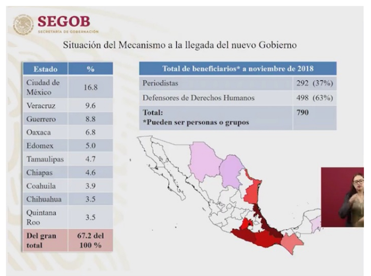 Agencias / La Voz de Michoacán Ciudad de México. El presidente de México, Andrés Manuel López Obrador, presentó esta mañana el mecanismo de protección para periodistas y defensores de derechos humanos en Palacio Nacional. En conferencia de prensa en Palacio Nacional, López Obrador instruyó a la Secretaría de Gobernación (Segob) a reemplazar las escoltas de periodistas y defensores de derechos humanos en riesgo por su labor, por personal de la Secretaría de la Defensa Nacional (Sedena) y de la Policía Federal (PF). Foto: Tomada de video. Por su parte, el subsecretario de Derechos Humanos, Migración y Población de la Secretaría de Gobernación, Alejandro Encinas, anunció esta mañana que se implementarán tres medidas en el mecanismo de protección a periodistas y defensores de derechos humanos, las cuales son: Acciones urgentes. Tecnológicas y físicas. Preventivas. Confirmó que ya suman 790 los beneficiaros de esa estrategia de apoyo, de los cuales 292 son periodistas y 498 son defensores de derechos humanos. Encinas Rodríguez reconoció que las acciones del mecanismo son de reacción y no prevención, e informó que existe una empresa privada que otorga las medidas de protección. Ante esto, esa empresa y todo el mecanismo serán auditados por parte del gobierno federal, ya que se han detectado sobrecostos y el personal que contrata a dicha compañía eran militares y marinos retirados, ya que RCU no tenía los permisos para la portación de armas. Situaciones de riesgo Dijo que además se analizan instrumentos que permitan identificar situaciones de riesgo y se evitan al máximo las medidas de carácter burocrático. El subsecretario refirió que desde el pasado 1 de diciembre a la fecha se han registrado seis homicidios de periodistas, de los cuales sólo uno estaba bajo la protección del mecanismo, y en cuatro casos ha habido detenidos. En el caso de activistas se han reportados nueve decesos y sólo se han esclarecido dos. Se necesita fortalecer el mecanismo con la participación de más periodistas, indicó.