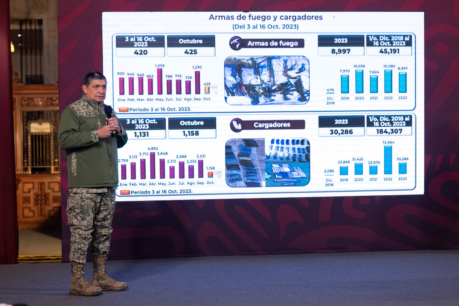 Redacción / La Voz de Michoacán Morelia, Michoacán. Con la detención de 46 miembros de la delincuencia organizada, el secretario del Defensa Nacional, Luis Cresencio Sandoval, destacó que la afectación ha sido para 3 cárteles y cinco células delictivas independientes, de estas últimas hay de Michoacán. Esta mañana, durante la conferencia matutina del presidente Andrés Manuel López Obrador, el General detalló que del 3 al 6 de octubre, a través del empleo de inteligencia, en coordinación con las Fuerzas Armadas y la Guardia Nacional, se detuvo a 9 integrantes del Cártel Jalisco Nueva Generación (CJNG),11 del Cártel del Golfo, 3 de la Unión de León y 23 de grupos independientes. El titular de la Sedena desglosó que las detenciones del CJNG ocurrieron en Jalisco (5) y Guanajuato (4); las del Cártel del Golfo en San Luis Potosí; las de la Unión de León en Guanajuato, y de las células independientes en Michoacán (16) y Guanajuato (7). ARSENAL DECOMISADO Por otra parte, Cresencio Sandoval informó que del primero de diciembre de 2018 al 16 de octubre de 2023, se han decomisado 2 mil 970 granadas, y solo este años 533. Asimismo, durante el lapso citado, se han asegurado 19 millones 759 mil 589 cartuchos, de este total, un millón 71 mil 498 corresponden al presente año.