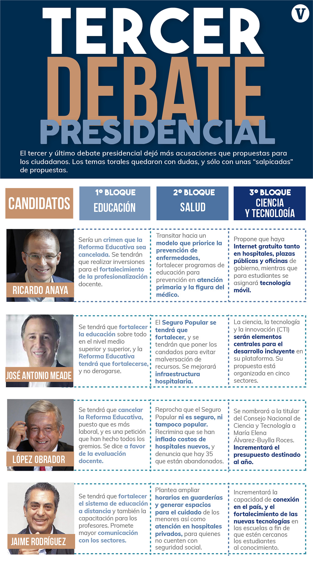 Jorge Manzo/ La Voz de Michoacán Morelia, Michoacán. Lo que prevaleció en el tercer y último debate presidencial no fueron las propuestas, coinciden especialistas que han analizado el "encontronazo" de los cuatro aspirantes a relevar a Enrique Peña Nieto, lo cierto es que fueron abordados temas torales que "duelen" a los mexicanos y en donde urgen definiciones claras para conocer la política que impulsarán. José Antonio Meade, Jaime Rodríguez Calderón, Andrés Manuel López Obrador y Ricardo Anaya discutieron durante dos horas de varias materias entre ellas, educación, salud así como ciencia y tecnología. Aquí un resumen de las propuestas.