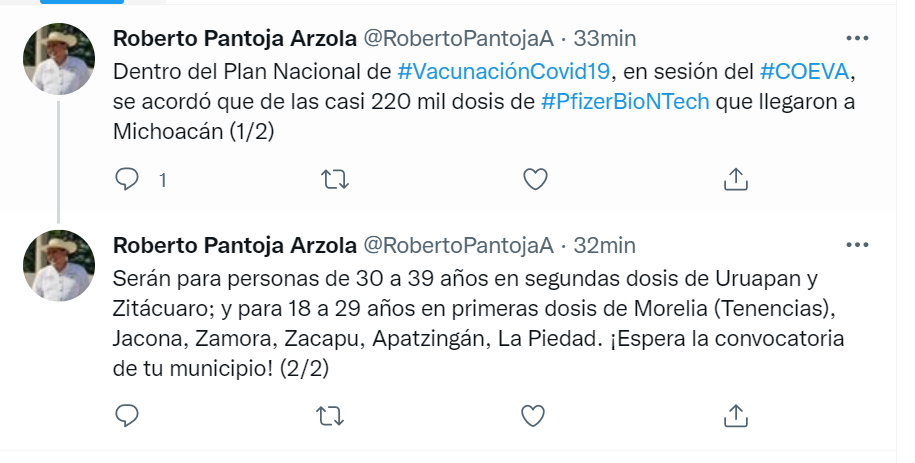 Apenas ayer Pantoja Arzola informó que dentro de la estrategia nacional, de las 585 mil dosis de vacunas de la farmacéutica Pfizer BioNTech que arribaron a México el miércoles, 219 mil 960 serían para Michoacán, y que servirían principalmente para las primeras dosis a jóvenes de 18 a 29 años.