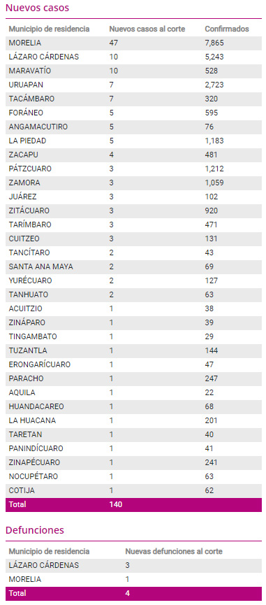Jorge Manzo/La Voz de Michoacán Michoacán. Será entre junio y julio del próximo año que estaría llegando la vacuna para proteger de COVID-19 a los michoacanos, aunque de manera inicial se prevé que sea aplicada solamente en adultos mayores y grupos vulnerables, pronosticó la epidemiológica y secretaria de Salud, Diana Carpio Ríos. Todo dependerá de la producción y de la distribución del biológico. La vacuna creada por los laboratorios Pfizer-BioNTech es la que ya comenzó a aplicarse en el país, y se prevé que a partir de enero comiencen a llegar las primeras dosis de la farmacéutica china CanSino, aunado a que la biotecnológica Novavax ha comenzado en México y Estados Unidos con la fase 3 de los ensayos para lograr el antídoto contra ese virus. La vacuna es la esperanza y el reto. Es la esperanza porque todos queremos que esto (el coronavirus) ya no exista”, confesó la doctora Carpio durante con La Voz. Admitió que es inevitable la venta de la vacuna por la parte privada, incluso, reconoció que es indispensable. Adelantó que serán varias las que existan en el mercado, producto de la demanda que existe. Foto: EFE. Hasta hoy, se reportan 32 mil 595 personas que han dado positivo a esta enfermedad, de las que 2 mil 616 han perdido la vida. En todo Michoacán hay más de mil 600 pacientes con el virus activo, sin contar a quienes de manera asintomática también son portadores del SARS-CoV2. El epicentro de la pandemia está claramente ubicado en Morelia. En enero se prevé que comience la vacunación de los médicos que están en la primera línea de batalla. A nivel nacional comenzará una campaña simultánea para protegerlos del SARS-CoV2, anticipó la secretaria de Salud. Se espera que los médicos michoacanos también sean contemplados en esta fase contemplada en el programa que correrá hasta diciembre del 2021. Mi pronóstico es que entre junio y julio (del próximo año) haya vacunación para adultos mayores y grupos vulnerables. Y eso significa que habrá adolescentes, jóvenes, contagiándose todo este tiempo”, alertó la secretaria de Salud, tras reconocer que los responsables de la estrategia no han informado cuándo le tocará a la población en general y cuántas dosis. Elogió el trabajo que desarrollaron los creadores del biológico, puesto que tenerlo en tan corto tiempo representa un gran logro para la ciencia. El virus fue detectado hace poco más de un año. Se trata de una vacuna con manejo genético, no se le implantó el virus a un ente vivo, con anticuerpos, sino que fue manejada genéticamente, y se aplicará en humanos. Espera que en las próximas semanas sigan arribando remesas de dosis, a fin de que se pueda proteger al resto de la población, aunque recordó que todo está calendarizado en la estrategia. “Hoy la vacuna se está aplicando en la Ciudad de México y en Coahuila, pero esperamos que en enero llegue al estado para el personal que atiende enfermos por COVID-19”. De acuerdo con la Secretaría de Salud federal, la estrategia de vacunación incluye 4 etapas, de diciembre de 2020 a junio de 2021. La primera que se extiende hasta febrero de 2021 contemplará a personal de salud de primera línea de control de COVID-19. La segunda, que se prolonga hasta abril, al personal de salud restante y personas de 60 años y más. La tercera etapa de aplicación del biológico abarca de abril a mayo y contempla a personas de entre 50 y 59 años de edad. Mientras que a mexicanos de entre 40 y 49 años de edad será entre mayo y junio. Después de marzo, será el resto de la población. La agilidad de la misma también dependerá de las dosis que lleguen al país. “Mientras eso no ocurra (que haya vacunas aplicadas y distribuidas en todos) habrá infección (por coronavirus), bolsas de infecciones, personas graves (por complicaciones de la enfermedad), por lo que no podemos dejar de cuidarnos. Nuestra actitud debe ser permanente de alerta, porque el virus ahí va a estar”, sentenció la secretaria de Salud en la entidad. AUMENTAN LOS CASOS Michoacán comenzó la última semana de diciembre con 140 casos nuevos de la enfermedad provocada por el virus SARS-CoV-2, y registra un acumulado de 32 mil 595 contagios. Y con cuatro muertes más, suma 2 mil 616. La capital michoacana notificó el mayor número de casos diarios al corte de este 28 de diciembre, con 47; mientras que Lázaro Cárdenas y Uruapan reportaron 10. Casos acumuladosConfirmadosRecuperadosMuertesMorelia7,8656,853581Lázaro Cárdenas5,2434,845320Uruapan2,7232,396267Pátzcuaro1,2121,06675La Piedad1,1831,05254Zamora1,059881100 Los decesos que se agregaron al registro estatal ocurrieron en Lázaro Cárdenas (3) y Morelia (1). En el estado se han recuperado de la enfermedad 28 mil 364 personas, de las cuales, 6 mil 853 han sido dadas de alta en Morelia, 4 mil 845 en Lázaro Cárdenas, 2 mil 396 en Uruapan, mil 66 en Pátzcuaro y mil 52 en La Piedad. Sobre cantidad de contagios, el municipio de Morelia se encuentra en primer lugar, con 7 mil 865; le siguen Lázaro Cárdenas, con 5 mil 243; Uruapan, con 2 mil 723; Pátzcuaro, con mil 212, La Piedad, con mil 183, y Zamora, con mil 59.
