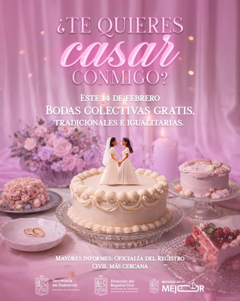 Morelia, Michoacán.- El próximo 14 de febrero las personas que deseen casarse podrán hacerlo de gracias a la campaña Bodas Colectivas Gratis, que impulsa el Registro Civil Michoacán.