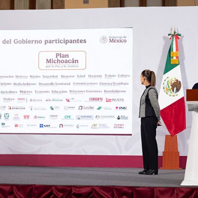 Redacción / La Voz de Michoacán Morelia, Michoacán. La presidenta de México, Claudia Sheinbaum Pardo, informó que la próxima semana se darán a conocer el avance de los 12 ejes del Plan Michoacán por la Paz y la Justicia. Durante la “mañanera del pueblo” en Palacio Nacional, la mandataria mexicana destacó que la estrategia del gobierno federal en la entidad michoacana implica presencia de los Servidores de la Nación, Ferias del Bienestar, el programa integral de seguridad pública, así como el programa para erradicar la extorsión, este último “que tenemos que hacer en Michoacán”. Además, obras públicas en carreteras, escuelas, y la Beca Gertrudis Bocanegra, que consiste en mil 900 bimestrales para transporte público de estudiantes de universidades públicas. Recordó que el pasado viernes se presentó una parte de lo que estás haciendo las secretarías de Gobernación (Segob) y del Bienestar, y ayer domingo, Omar García Harfuch, titular de la Secretaría de Seguridad y Protección Ciudadana (SSPC), presentó resultados del Gabinete de Seguridad. Finalmente, Sheinbaum Pardo precisó que será entre el 10 y 11 de diciembre cuando se brinde información de los avances del Plan Michoacán.