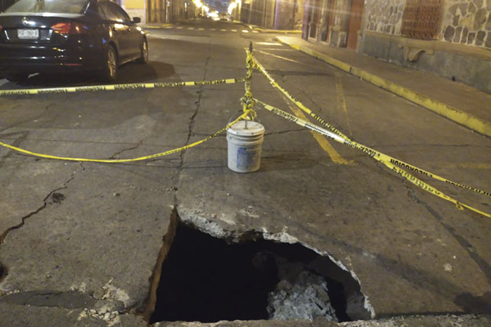 Redacción / La Voz de Michoacán Morelia, Michoacán. Un boquete se abrió en el pavimento de la calle Corregidora, entre Rayón y Andrés Quintana Roo, en pleno Centro Histórico, por lo que autoridades cerraron dicho tramo para evitar accidentes. Luego de las 21:45 horas elementos de seguridad acudieron a abanderar la zona, debido a que el socavón se abrió justo a la mitad de la calle, lo que representa un riesgo para las personas que pasan en sus vehículos o caminando, debido a la oscuridad de la noche. Foto: Cortesía.