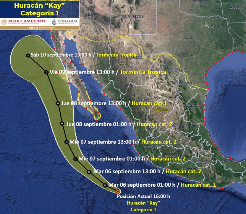 Trayectoria pronóstico del Huracán "Kay" Categoría 1. Imagen: SMN.