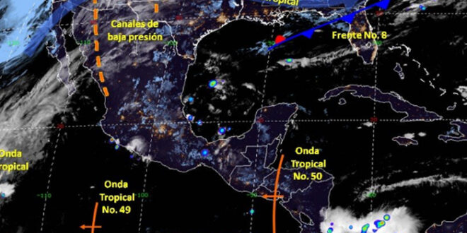 El SMN agregó que la nueva onda tropical número 50 que ingresará al sur de la Península de Yucatán, canales de baja presión, sobre el noroeste, el occidente y el centro del país, y uno más sobre el suroeste del Golfo de México, en interacción con la abundante entrada de humedad del Océano Pacífico, originarán las condiciones mencionadas.
