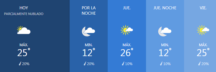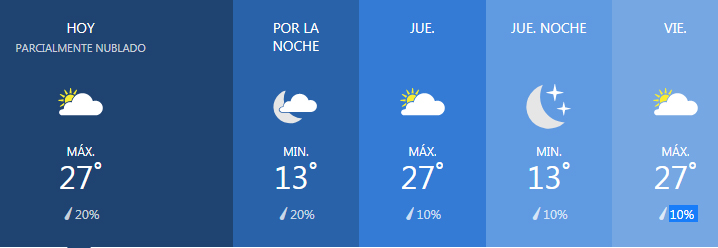 Cielo parcialmente cubierto. Máxima de 27 C. Vientos del E de 10 a 15 km/h.