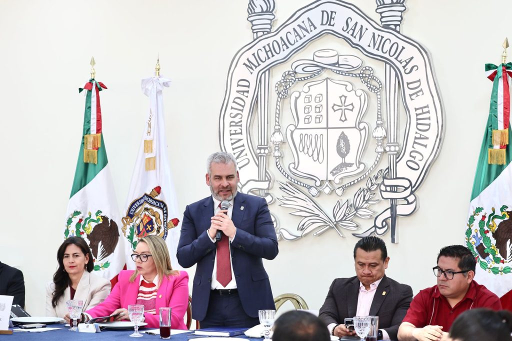 Redacción / La Voz de Michoacán Morelia, Michoacán. La reforma constitucional a la Universidad Michoacana de San Nicolás de Hidalgo (UMSNH), permitirá presupuesto pleno para la Máxima Casa de Estudios y que continúe creciendo en favor de la educación, porque Michoacán requiere una universidad líder, señaló el gobernador Alfredo Ramírez Bedolla, durante un encuentro con la rectora Yarabí Ávila González, así como con integrantes del Consejo Universitario. En la sede de la rectoría de la Casa de Hidalgo, el mandatario destacó que la universidad es un baluarte por lo que ahora, a los universitarios les toca la responsabilidad de la democratización y buscar el mejor modelo de jubilaciones y pensiones, siempre buscando lo mejor para la Máxima Casa de Estudios, a fin de salir fortalecidos y unidos de estos procesos. El gobernador expuso que una vez que los cabildos aprueben la reforma aprobada por el legislativo, el Consejo Universitario tendrá que actualizar la Ley Orgánica en un término de hasta 90 días. Recalcó que, como parte del presupuesto pleno, para el siguiente año la universidad contará con 750 millones de pesos adicionales a lo ejercido en 2024, ya que así se encuentra establecido en la modificación a la Constitución de Michoacán, donde se puntualiza que el 4.5 por ciento del presupuesto anual del estado deberá destinarse para la universidad. Además, Ramírez Bedolla resaltó que la reforma también contempla autonomía plena, un esquema de pensiones y democratización, ya que la elección del rector o rectora se llevará a cabo por voto, donde participen todos los integrantes de la UMSNH. Foto: Cortesía En tanto, la rectora Yarabí Ávila González agradeció al mandatario la iniciativa que presentó al Congreso local y que ahora fue aprobada, al ser una modificación histórica, la cual establece elevar a rango constitucional los derechos de los nicolaitas y garantizar su consolidación. Durante el evento, directoras y directores de las distintas facultades agradecieron al gobernador su visión para concretar la estabilidad de la Máxima Casa de Estudios, lo cual se verá reflejado en diversos rubros. Al final del evento, en la sede de la rectoría, se develó una placa donde agradecen al mandatario haber impulsado la reforma para la Universidad Michoacana.