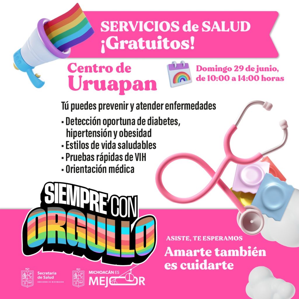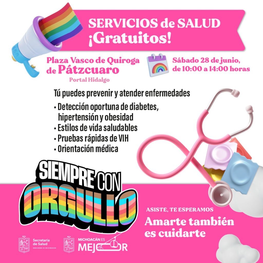 En el marco del cierre de las actividades conmemorativas del Mes del Orgullo LGBTTTIQ+, la Secretaría de Salud de Michoacán (SSM) llevará jornadas de salud gratuitas a los municipios de Pátzcuaro, Uruapan y Lázaro Cárdenas. Las actividades se desarrollarán el sábado 28 junio en la plaza “Vasco de Quiroga” de Pátzcuaro, el domingo 29 en el centro de Uruapan y el lunes 30 de junio en la Universidad Politécnica de Lázaro Cárdenas, en un horario de 10:00 a 14:00 horas. En los módulos, el personal de salud brindará servicios gratuitos de detección oportuna de enfermedades como diabetes, hipertensión y obesidad, aplicación de pruebas rápidas de VIH y hepatitis C, promoción de estilos de vida saludables, orientación médica general e información sobre derechos en salud. Estas acciones forman parte del esfuerzo permanente de la SSM por garantizar una atención médica respetuosa y libre de discriminación, con especial atención a la comunidad LGBTTTIQ+.
