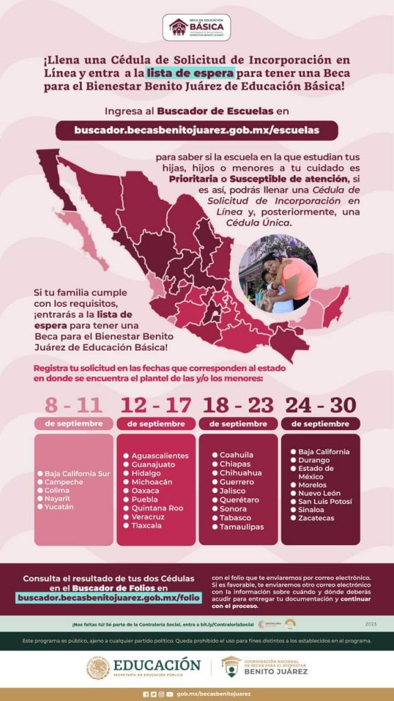 Redacción / La Voz de Michoacán Morelia, Michoacán. Del 12 al 17 de septiembre abrirá para el estado de Michoacán la plataforma para que mamás, papás o tutores con estudiantes preescolar, primaria o secundaria pública puedan solicitar la Beca para el Bienestar “Benito Juárez”. Roberto Pantoja Arzola, delegado de Programas para el Bienestar en el estado, informó que la Secretaría de Educación Pública (SEP) dio a conocer el proceso de registro para la solicitud en línea a la lista de espera de estas becas que ofrece el Gobierno de México, que actualmente atienden a casi 200 mil familias beneficiarias en la entidad. Señaló que en esta ocasión la plataforma nacional abrirá por estados y la incorporación al programa está sujeta a la disponibilidad presupuestal. Los interesados deben: 1. Ingresar a la página de Internet buscador.becasbenitojuarez.gob.mx/escuelas, para verificar si la escuela donde estudian aparece como Prioritaria o Susceptible de Atención. 2. Si es prioritaria o susceptible, llenar una cédula de solicitud de incorporación en línea y posteriormente la cédula única. 3. Una vez llenado los requisitos, tu familia entra a la lista de espera. Es importante registrar un correo electrónico al que tengan acceso, ya que ahí les será enviado el folio de tu solicitud y si la familia es seleccionada, la información sobre cuándo y dónde deberás acudir para entregar la documentación y continuar con el proceso.
