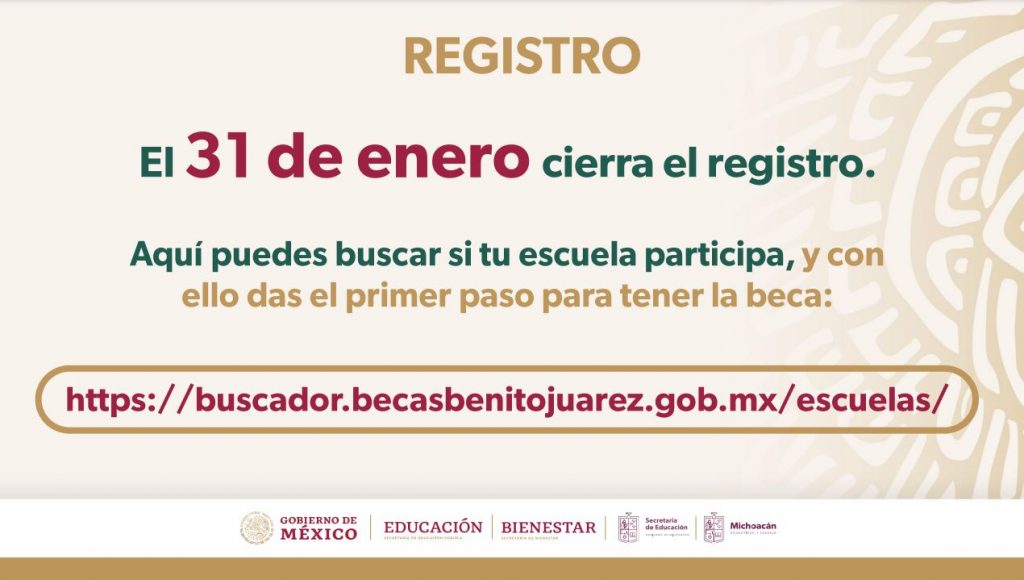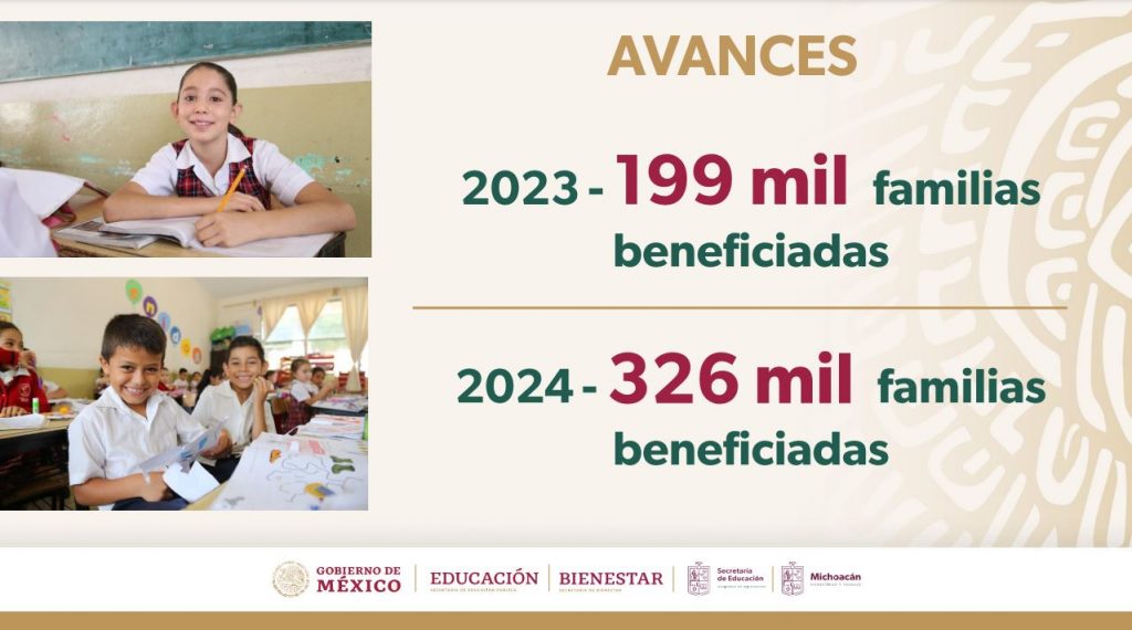 Redacción / La Voz de Michoacán Morelia, Michoacán.- El delegado de Morena en Michoacán, Roberto Pantoja, indicó esta mañana que este 2024 se aumentará la cantidad de familias beneficiadas con las becas Bienestar para alumnos y alumnas de educación básica alcanzando hasta 326 mil familias. En conferencia de prensa junto al gobernador del estado, detalló que participarán 4 mil 700 escuelas para que los alumnos reciban $1,840 por bimestre dando prioridad a la zonas indígenas y marginadas.Informó que se tiene hasta el 31 de enero para registrar la solicitud. Por su parte la secretaria de Educación Gabriela Molina aclaró que en educación básica -primaria- no se puede tener más de una beca por familia y en el nivel media superior -secundaria- se puede tener por alumno. Señaló que los interesados deben de consultar primero si las escuelas a las que acuden participan en al programa en la liga: https://buscador.becasbenitojuarez.gob.mx/escuelas/ La secretaria informó que se tienen 127 mil nuevas becas para Michoacán, lo que significa que cada 1 de 3 estudiantes la recibirá. REQUISITOS -Acta de nacimiento-CURP-Comprobante de domicilio-Número de teléfono-Correo electrónico personal y activo-Nombre, clave y domicilio de la escuela