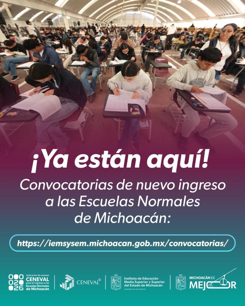 Michoacán / Educación. El Instituto de Educación Media Superior y Superior del Estado (Iemsysem) informa que ya están abiertas las convocatorias para ingresar a las ocho Escuelas Normales Oficiales y al Centro de Actualización del Magisterio en Michoacán (CAMM), manteniéndose una oferta de mil 80 espacios disponibles. Con la publicación de las convocatorias de nuevo ingreso, disponibles en: iemsysem.michoacan.gob.mx/convocatorias/ da inicio formal el proceso de admisión correspondiente al ciclo escolar 2026-2027. Por quinto año consecutivo, la selección de aspirantes se realizará mediante el examen Ceneval, mecanismo que ha fortalecido la transparencia, el orden y la equidad en el ingreso a la formación docente. La directora general del Iemsysem, Mariana Sosa Olmeda, destacó que para este proceso se mantiene una oferta de mil 80 espacios disponibles en las nueve instituciones formadoras de docentes en la entidad. Asimismo, detalló que del 11 al 29 de mayo se entregarán las fichas en los centros educativos correspondientes de 09:00 a 14:00 horas. La aplicación del examen se realizará el domingo 5 de julio, y los resultados serán publicados el 6 de julio en periódicos de circulación estatal. De acuerdo con el proceso, las matrículas disponibles son las siguientes: 123 lugares para la Escuela Normal para Educadoras; 150 para la Benemérita y Centenaria Escuela Normal Urbana Federal; 124 para la Escuela Normal de Educación Física; 128 para la Escuela Normal Superior de Michoacán; 128 para el Centro Regional de Educación Normal de Arteaga; 127 para el Centro Regional de Educación Normal Preescolar de Arteaga; 140 para la Escuela Normal Rural “Vasco de Quiroga” de Tiripetío; 100 para la Escuela Normal Indígena de Michoacán; y 60 para el Centro de Actualización del Magisterio en Michoacán. Finalmente, se informó que las sedes para la aplicación del examen Ceneval serán el recinto ferial para las y los aspirantes a las Normales de Morelia; la Escuela Normal Rural “Vasco de Quiroga” en Tiripetío, para quienes aspiran a esta institución; el Instituto Tecnológico Superior de Uruapan (ITSU), para sustentantes a la Normal Indígena; y el Instituto Tecnológico de Lázaro Cárdenas, para quienes buscan ingresar a las normales de Arteaga. Redacción / La Voz de Michoacán