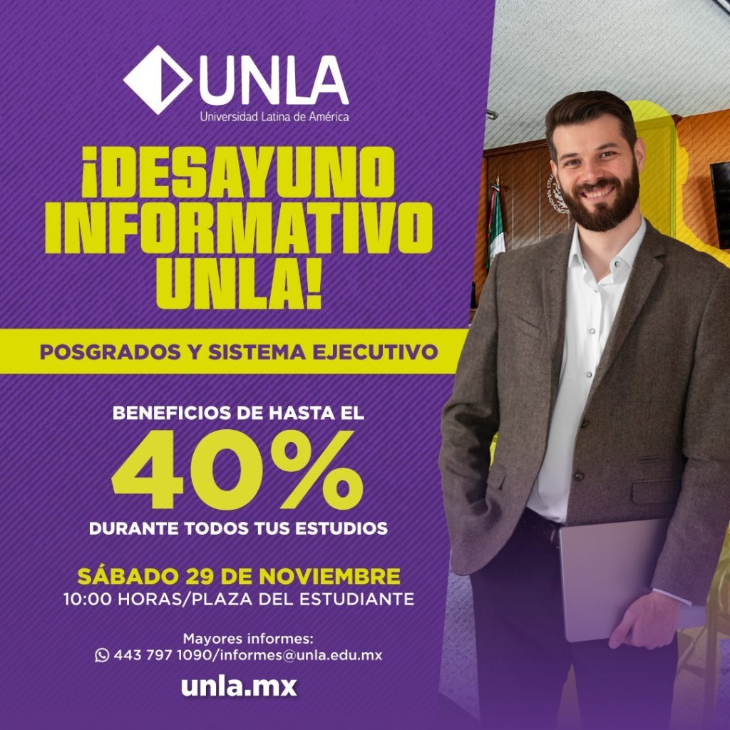 Morelia, Michoacán. - ¿Estás buscando estudiar una segunda carrera, titularte mientras trabajas o continuar tu preparación con una maestría o doctorado?¡Esta es tu oportunidad! La Universidad Latina de América (UNLA) te invita al Desayuno Informativo de Posgrados y Sistema Ejecutivo, un evento donde podrás descubrir todas las opciones académicas que la UNLA tiene para ti, conocer a los coordinadores de los programas, resolver tus dudas de primera mano y obtener hasta un 40% de beneficio durante todos tus estudios. El evento se llevará a cabo el sábado 29 de noviembre de 2025 a las 10:00 a.m. en la Plaza del Estudiante del campus UNLA, y ofrecerá un ambiente cálido y profesional ideal para generar networking con docentes y aspirantes, además de brindar atención personalizada por parte de los coordinadores de cada programa. Todo esto acompañado de un delicioso desayuno para iniciar bien la mañana mientras se conocen las oportunidades académicas que ofrece la UNLA. ¿Quieres asistir? Confirma tu lugar hoy mismo: Haz clic para enviar WhatsAppO escribe a: informes@unla.edu.mx Sistema Ejecutivo (licenciaturas) Ideal para quienes trabajan o buscan una alternativa flexible.Clases presenciales los sábados y virtuales los viernes por la tarde. Termina tu carrera en menos de 3 años con la misma validez oficial que el sistema escolarizado. Administración de Empresas Contaduría Pública Derecho Posgrados UNLA Programas con alta calidad académica y docentes especialistas de diversas partes del país, pensados para responder a los desafíos actuales con una visión ética, crítica y transformadora. Maestrías: Derecho Constitucional Mercadotecnia Logística y Comercialización Planeación Fiscal y Tributación Internacional Planeación Territorial Doctorados: Ciencias Administrativas Derecho